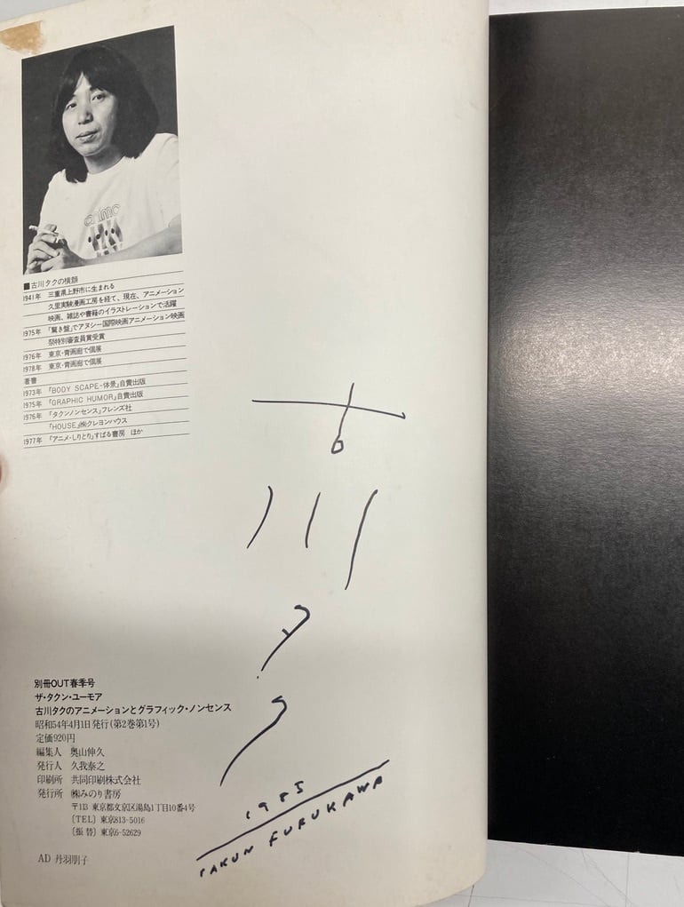 以前紹介した「タクンノンセンス」の3年後です アニメーション、コミックス、漫画、CM、70年代の古川タクの全体を網羅した内容 ちなみに久里洋二と古川タクは師弟関係 裏表紙に若干のヨレ感 1979年 別冊OUT みのり書房刊