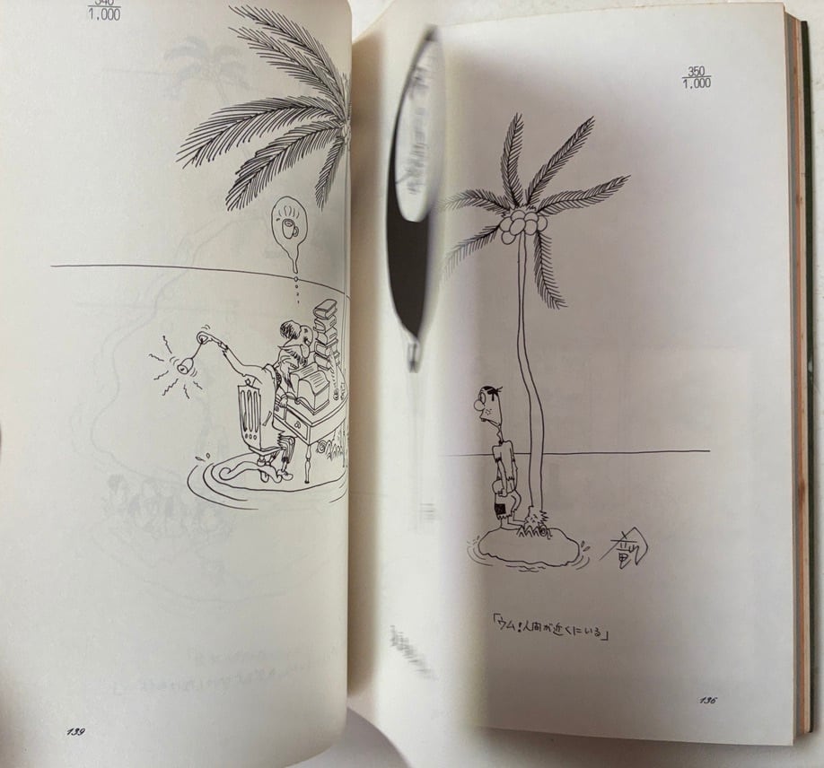 秋竜山の一枚マンガにかける執着はすごかったようです これは一番オーソドックスが孤島マンガですね ほかにいろいろテーマをきめて数百枚から千枚描いていたようです 孤島マンガも千枚描いていてそのなかの236枚が掲載されているようです 2023年に亡くなるたあとに残された漫画はどうなっているのだろうか? 1978年 初版 大陸書房