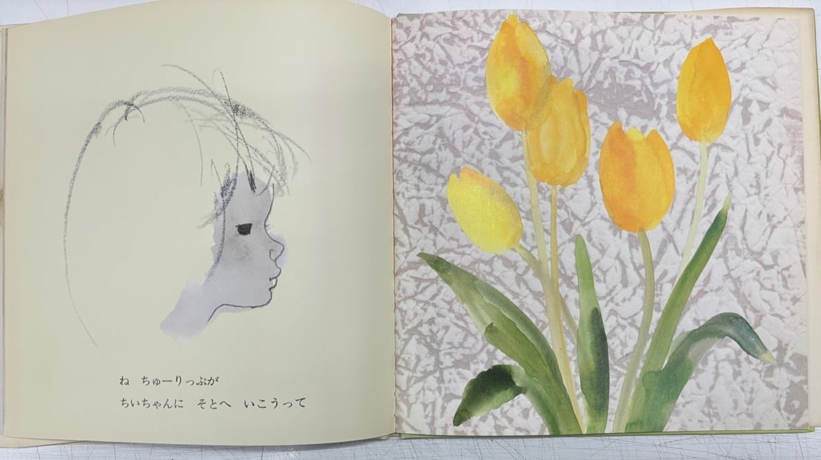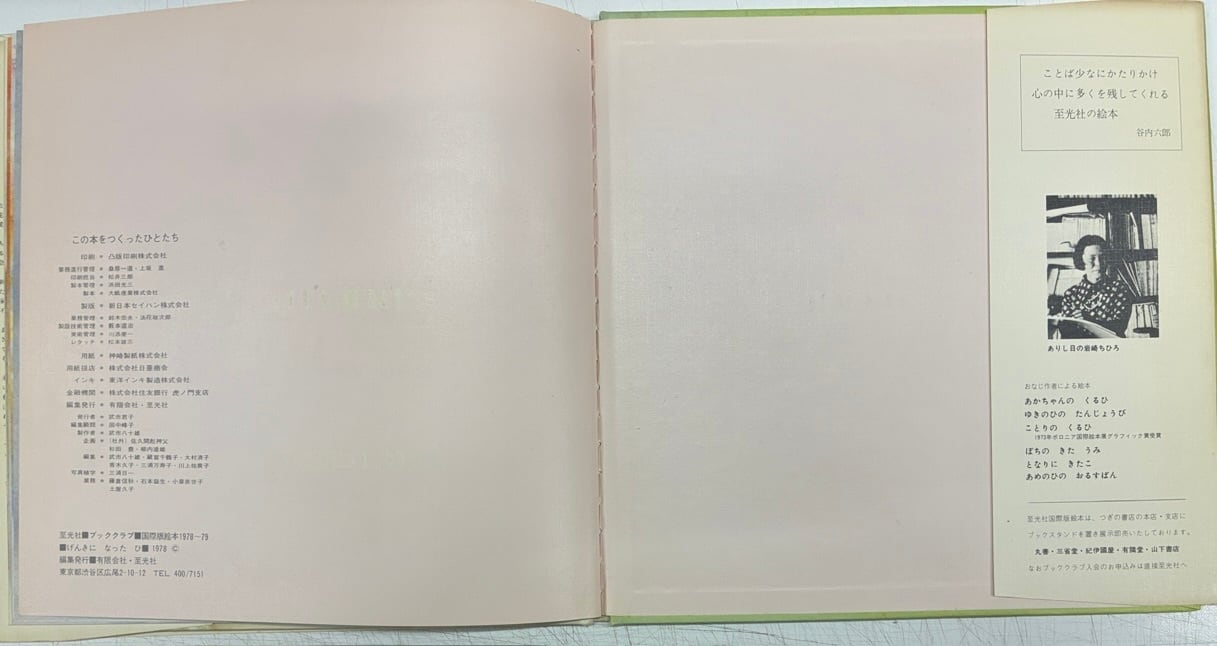 岩崎ちひろは、1974年に亡くなっているから 残された絵をもとに息子の松本猛と至光社の武市八十雄が、つくったようです 図書館本か背にシールはがし跡、後見返しにもはがし跡 1978年 初版 至光社