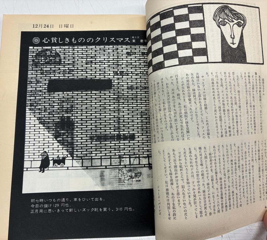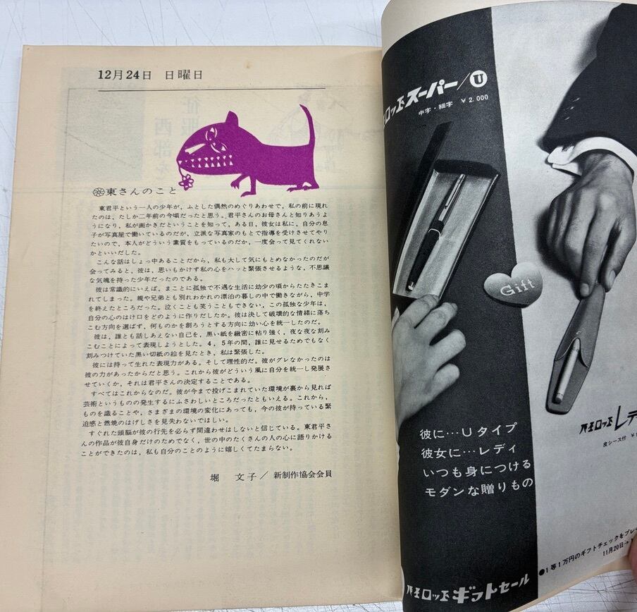 「東君平の世界」(サンリオ)をみると1962年「漫画読本」でデヴューとあるが、この「ホリディ」創刊号が、堀文子の推薦文とともに7ページの「心貧しきもののクリスマス」が掲載されている 挿絵も使われている 他に真鍋博や三木富雄がイラストを掲載 つまりこの「ホリデイ 創刊号」が東君平のデビューだと推察します 1961年 早川書房