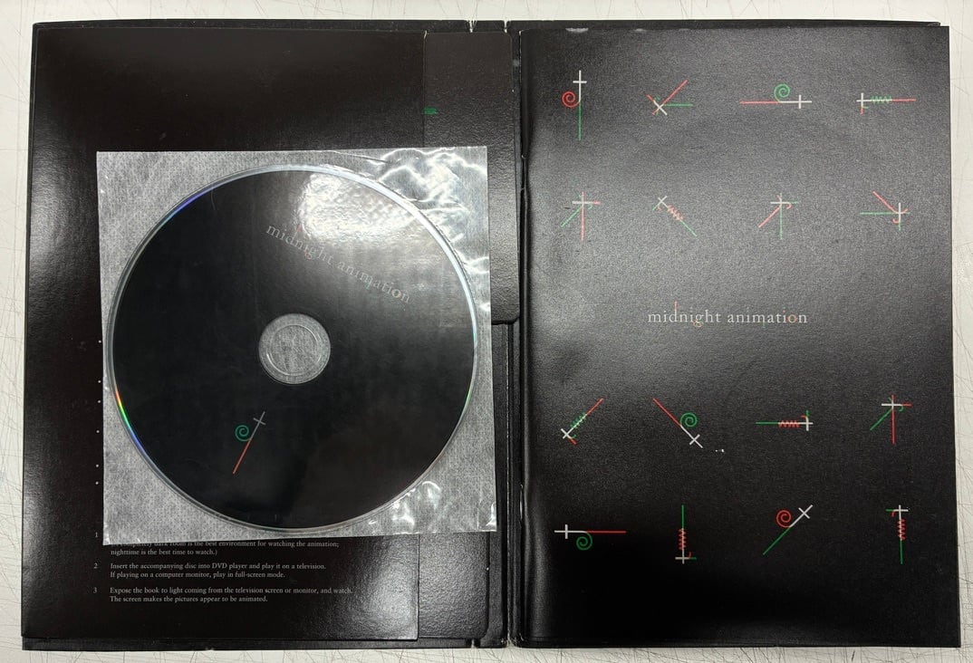 付属のDVDをテレビで再生し、部屋を暗くして点滅する赤と緑の光を本や付属のカードに当てることで、印刷されている絵柄がアニメーションのように動いて見えるというユニークな作品らしい すごいね 2007年 美術出版社