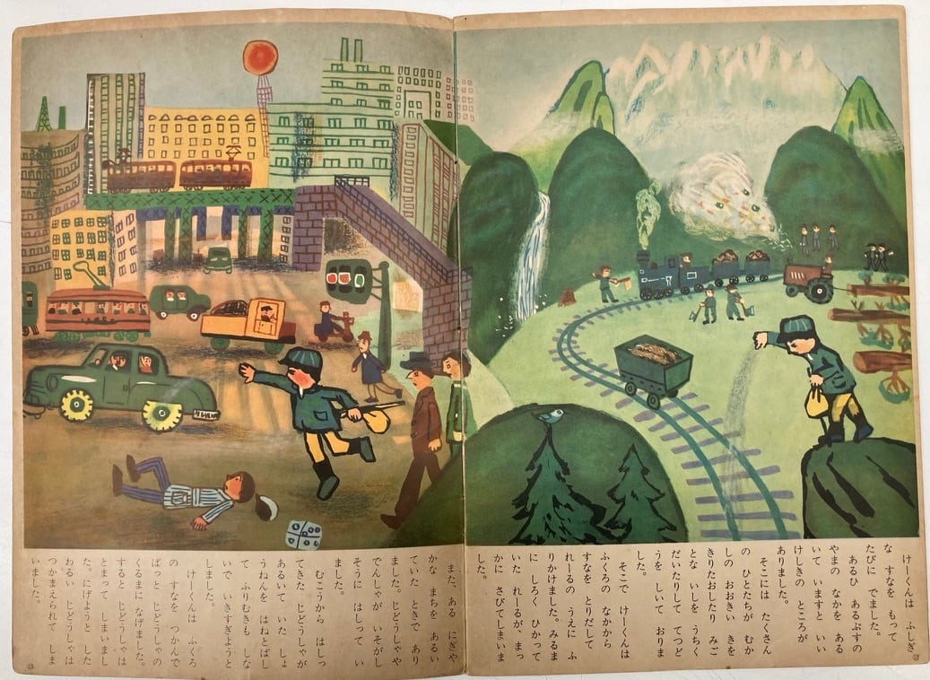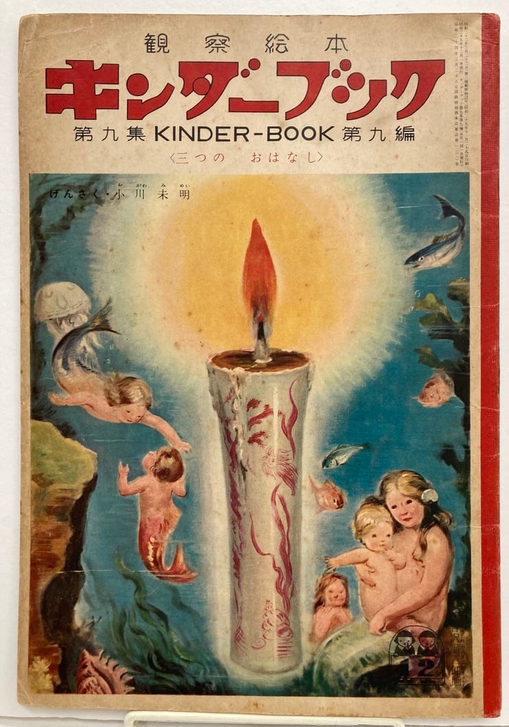 よく展覧会に紹介される茂田井の「ねむいまち」です 3見開きですが、お話をふくめ、茂田井の思いが伝わってきそうです 他には、高井貞一や中尾彰が描いています 表紙7センチほどの破れ 昭29 キンダーブック