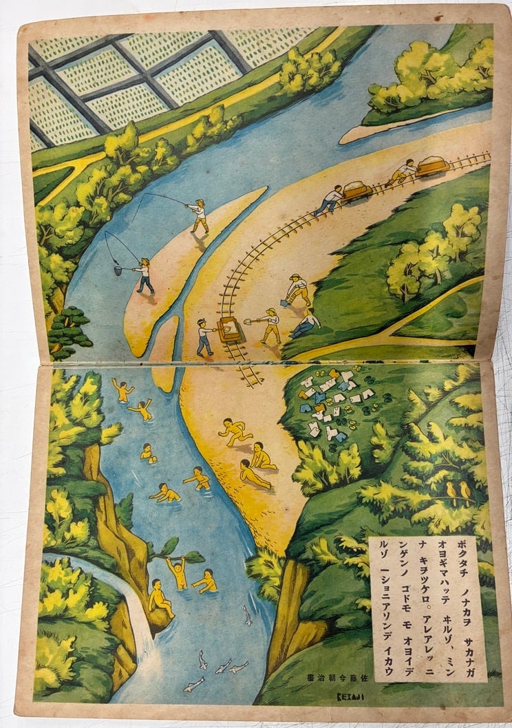 川を上流から下流にかけて俯瞰しながら縦にひらいていく 佐藤今朝治 福與英夫 木俣武の三人が絵を担当 経年のヨレ、破れあり 幼児標準絵本6 昭和15年(1940) 鈴木仁成堂
