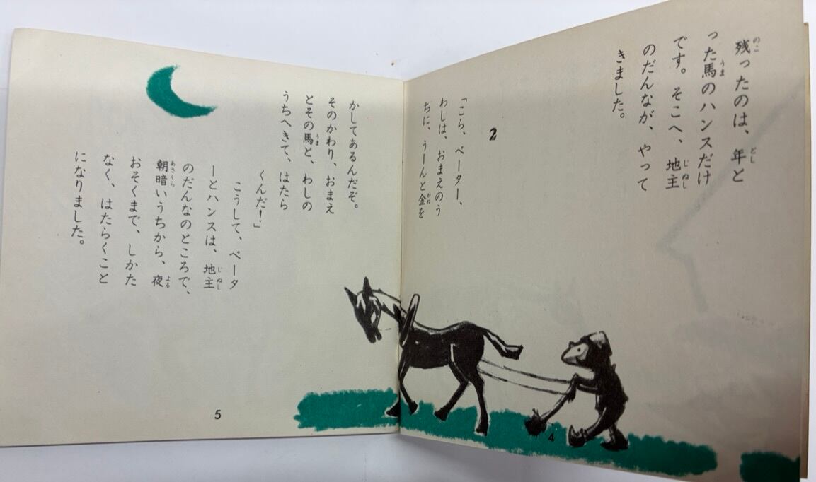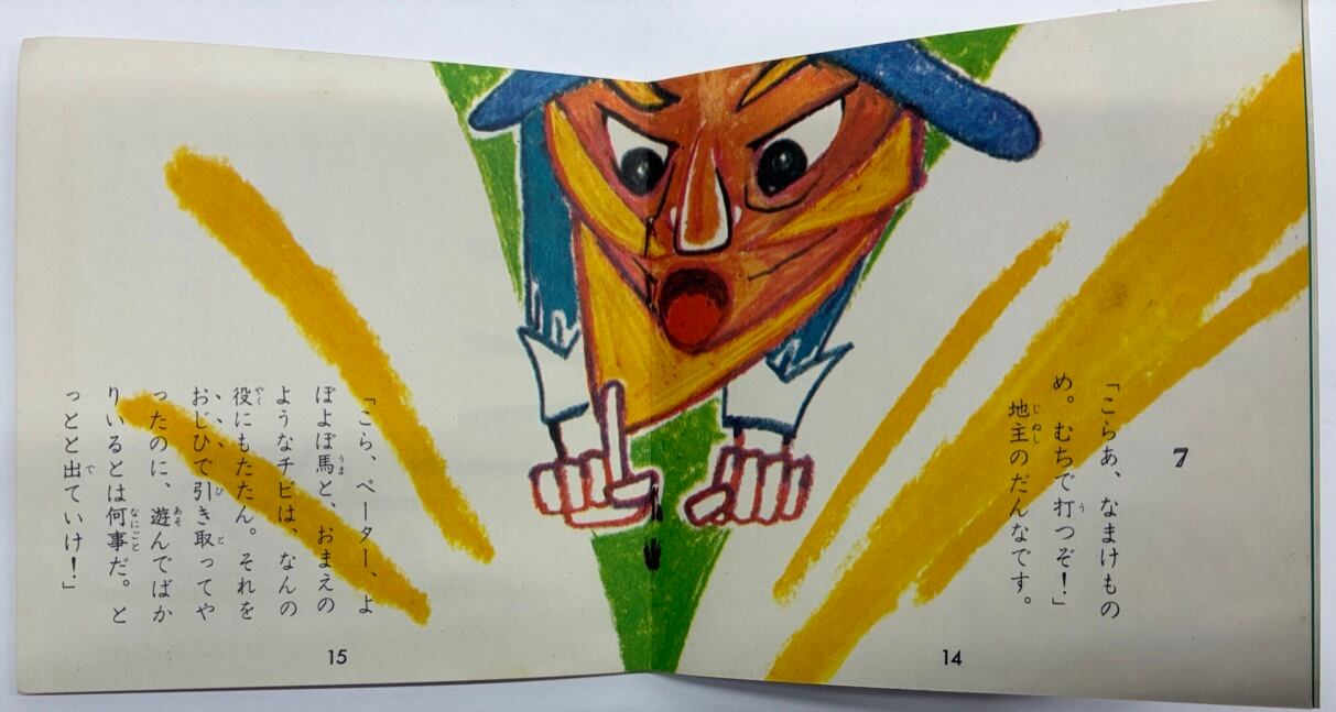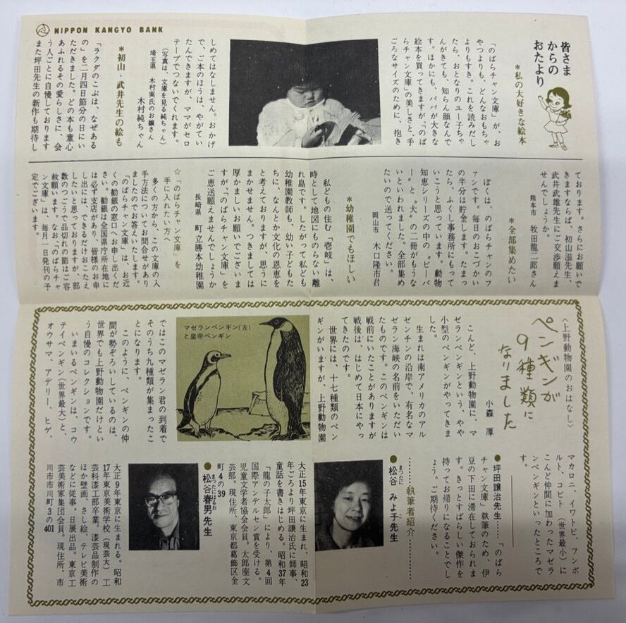 日本勧業銀行(みずほ銀行の前身)が、1960年代半ばに、のばらチャン文庫というシリーズ 30冊くらいを顧客向けに出していました 作家・絵描きも魅力的です この絵本は、絵を松谷春男、文は松谷みよ子です 作家の言葉が掲載の「のばらチャン文庫通信NO.4」あり 1960年代半ば 日本勧業銀行
