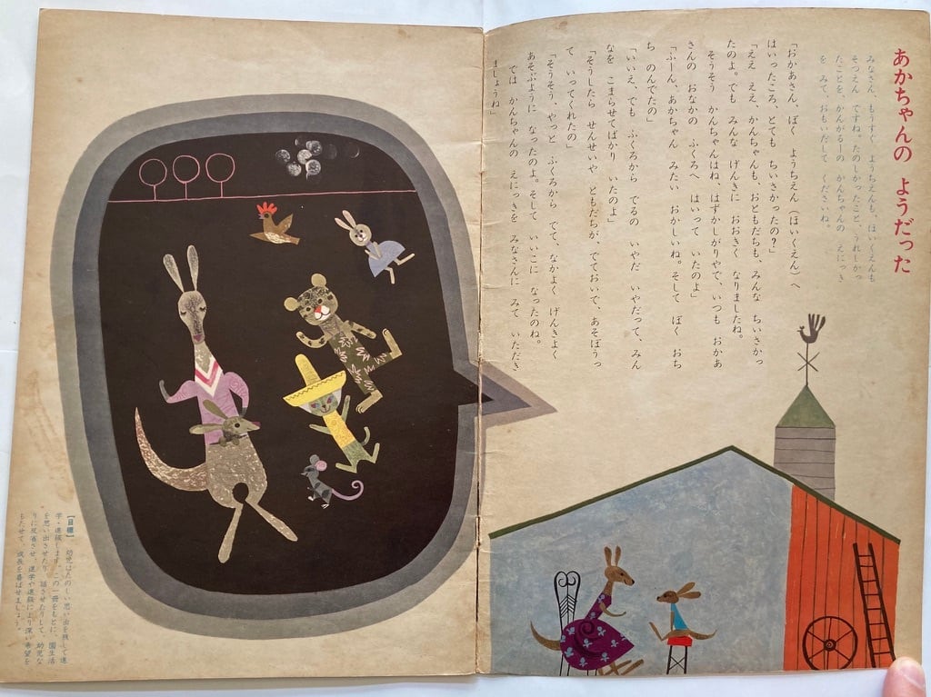 ひかりのくに 表紙にウノアキラ・え とあります。文章を書いた作家の名前がみあたりません。謎ですね。編集の方で宇野亜喜良さんと打ち合わせしながら作ったのかしら?昭和34年発行60年以上まえの絵ですね。当時のアメリカの作家アリス&マーチィン プロベンセンの影響がわかります。表紙にスレがあります。ひかりのくにの月刊絵本ですので、表紙こみで16ページです。昭和34年 ひかりのくに