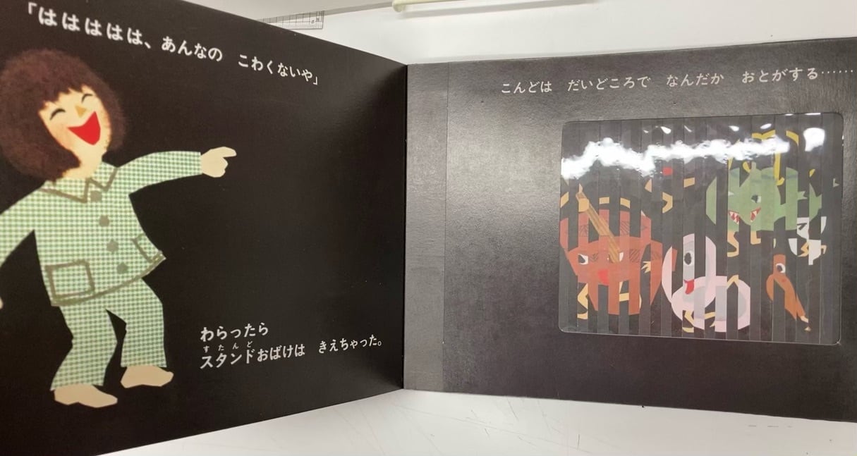 せなけいこにこんな絵本がありました。バンダイのうごくえほんです。写真でわかりますでしょうか、ページを開くことによって右ページの絵柄が変わっていくという仕掛けです。変わる絵は5見開きです。1980年 バンダイ出版刊 函わはあったかどうか、不明です。