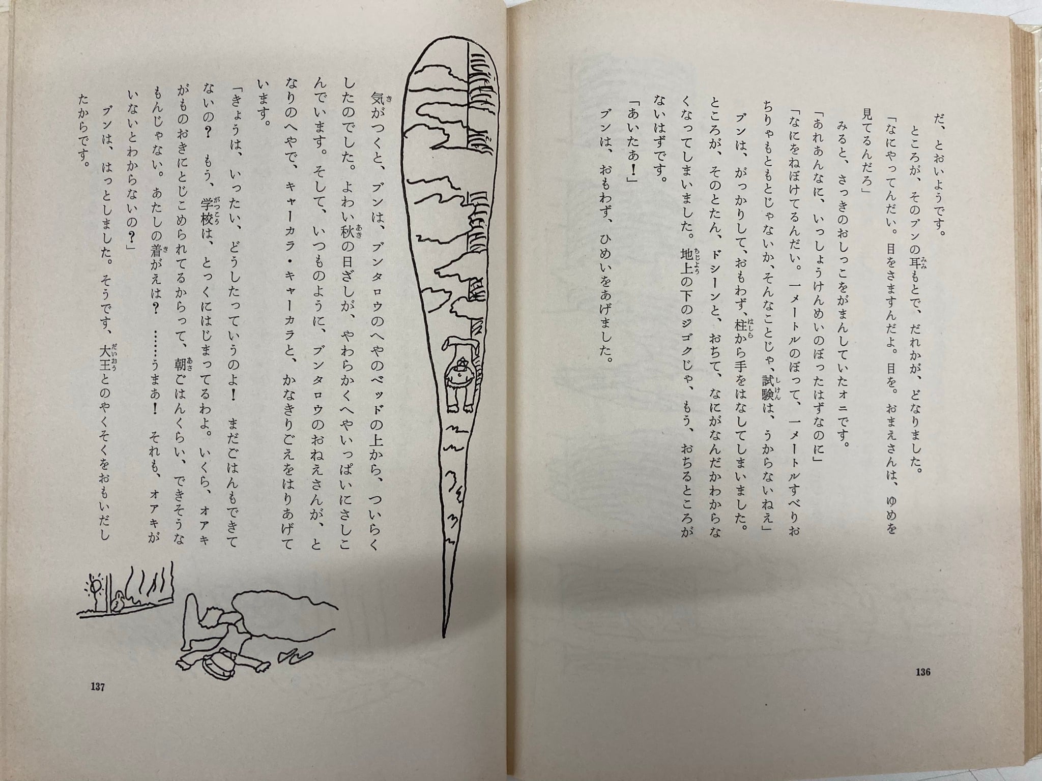 この時代の理論社の「日本の創作童話」シリーズはみなこの装丁だったのだろうか。装丁は長新太なのです。タイトルだけ変えてこの装丁に統一するのは、英断だと思うけど、いかがでしょう。長さんの大胆なセンスがひかります。そしてこの山中恒の名作「オニの子・ブン」は、びっくりすることに全見開きページに何らかの長新太による挿絵がこれえでもかと入っています。とても嬉しい気分になります。1962年に初版で、1966年の第六刷 函入 理論社刊