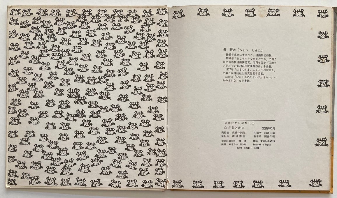 長さん流の猿蟹合戦はすごいね。スズキコージのが1色2色に対してこちらは、1色4色。つまり製作費との駆け引きといいましょうか。奥付に「日本むかしばなし①」とあるから本書からはじまったのでしょうね。そして発行日の記載がない。このシリーズは帯に発行日があります。1977年9月15日です。ほかに林静一の「つるのおんがえし」がある。版元の高橋書店は今では日記や手帳の版元で有名 長さんは昭和30年代、高橋書店発行の「週刊スリラー」という週刊誌の表紙を担当 1977年 ビニールカバー 帯 初版 高橋書店刊