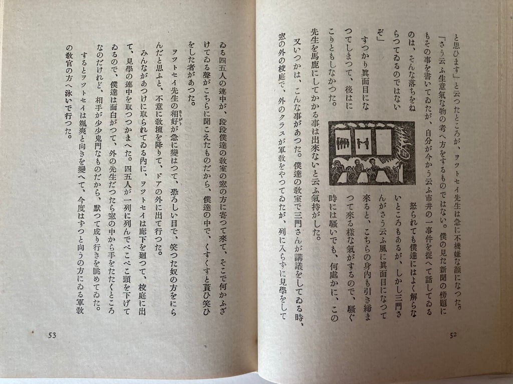 昭和12年の初版とは異装らしい。だからこの二刷本は古書的にはどうなんでしょう。本文中の谷中安規による挿絵のレイアウトがすばらしい。活字の中にいれたり、それぞれ工夫している、当時は当然のように活字組だから、アナログな計算が大変だったにちがいない。最後の方には見開きいっぱいに安規の挿絵の入り方にはびっくり!安規(こういうときは、親しみをこめてアンキと呼びます)はいいねえ。それと扉直後の內田百閒の文がいい!初版は昭和12年で本書は昭和17年の二刷本。小山書店刊 かろうじて元パラフィンがついている。