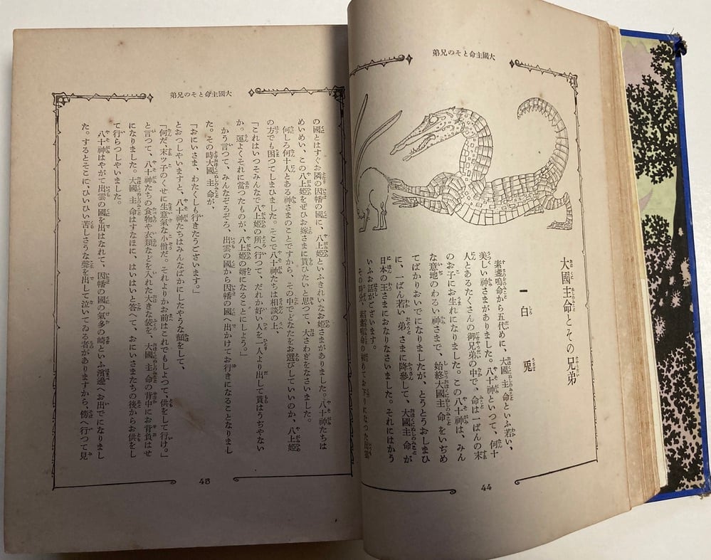冨山房の模範家庭文庫の全体像を知りたくて収集していました。日本の昔話、説話、神話などを網羅。編者の楠山正雄の評価を高めた仕事です。挿絵は上巻は、その作家の表記が見つからないのですが、下巻に装幀と挿絵 岡本帰一 挿絵 早川桂太郎とあります。故に上巻も見ているとこの二人の仕事だろうと推察します。岡本帰一もまだまだ認識不足で、そのうえ早川佳太郎もあまり知らない。ただ二人とも律儀にしっかりした線を描くが、魅力的かどうか?といったところ。函がない上に状態もそんなに良くない。ヨレヨレ!特に上巻はところどころ破れております。中身は国立国会図書館のデジタルデータ(モノクロ)で見られるみたいです。だから現物を、研究・資料として必要か、飾りとして本棚に並べるか、2冊揃っているのは、少ないとおもいますので、、、上巻は大正10年の初版で大正11年の三版、下巻は大正11年初版の大正13年の六版です。
