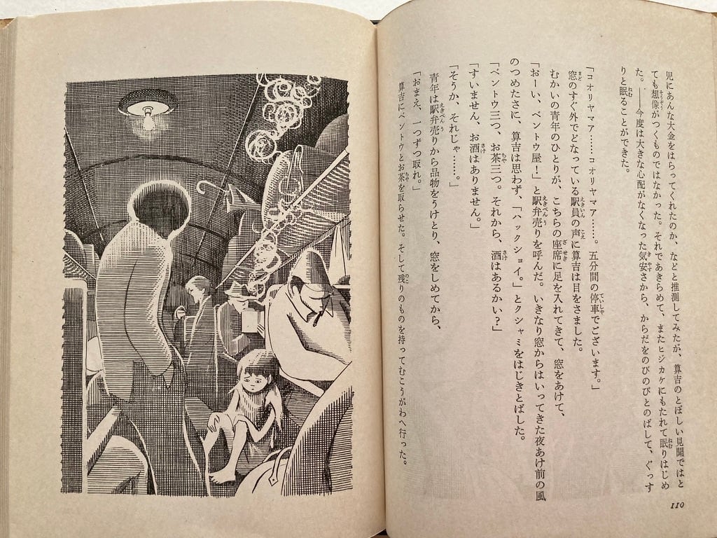 焼け跡を生き抜く上野の戦災孤児の話。この本、表紙が野間仁根で挿絵が六浦光雄という取り合わせ! 六浦光雄という作家は大好きな作家で漫画家でもあります。井上洋介さんもこの作家が好きでよく話していました。数年前、玄光社経由で遺族の方が残された原画を京都国際マンガミュージアムに寄贈されたと伺っています。私はその合間を縫って玄光社で存分に原画を楽しむことができました。六浦光雄はもっと評価してもらいたい作家で、周りでは好きな人たちもちらほらいて嬉しいのですが。こののち京都国際マンガミュージアムが、六浦の原画をどういう風に見せてくれるか楽しみです。昭和30年 初版 新潮社刊