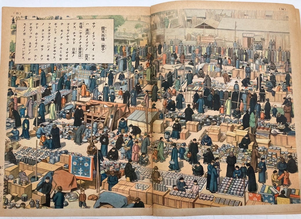 講談社の絵本は、月刊で出ていたのですね。この絵本は第3巻8号。子どもたちには、新天地としての満洲が紹介されています。「満洲国が生まれて8年」と前書きにあります。ちなみに「東京見物」もあり、当時子どもの和田誠の愛読書であり、近年、当時と同じアングルで、現在を和田誠が描いた絵本と、当時の復刻本の抱き合わせの絵本が講談社から出ました。昭和15年 初版 大日本雄弁会講談社