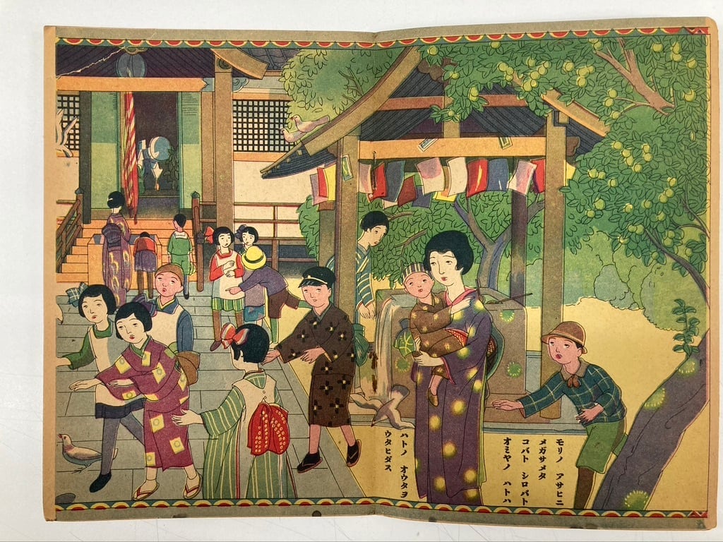 昭和初期の絵本 活版特色刷りでいいのかなあ。キッチュな色合いといえばいいのかなあ。美しい! 版ズレもこうなると美しい! 絵描きの名前はありません。奥付に印刷兼発行所・金井信生堂とありますから、印刷屋さんでもあってこの仕上がりかも。そして絵は、印刷の職人かもしれません。みな美男美女ですね。厚紙16ページの「ウタヘコドモ」「ウンドウ」「コドモノオシエ」の3冊が箱入りセット本。初版 昭和3年 金井信生堂