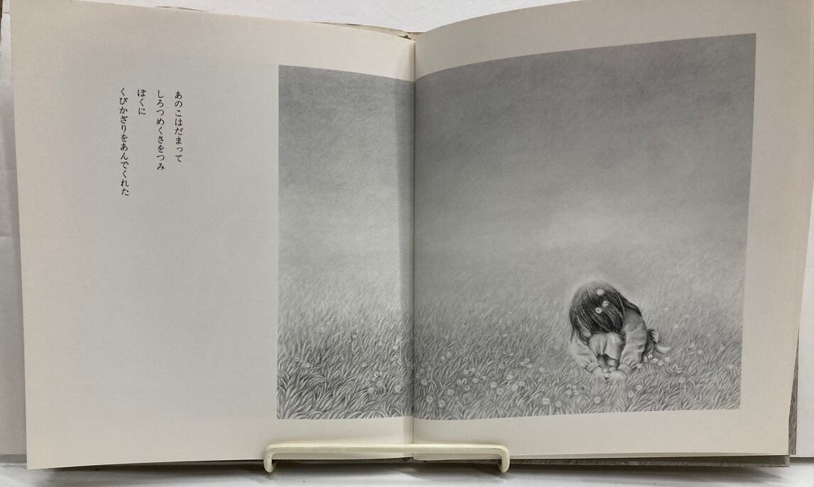 帯には「新しい詩の絵本の誕生!」とあります。このころかな絵本が子どものエンターテイメントという枠だけではなく、もっと広がりを模索しはじめていたのは、偕成社は79年に「絵本とおはなし」という月刊誌を創刊「MOE」につながるわけです。味戸ケイコ絵は雰囲気がありますね。初版は1975年でこの本は1976年の2刷 帯 カバー 偕成社刊