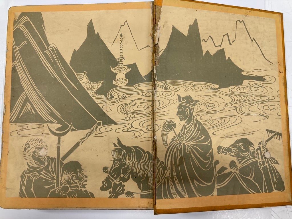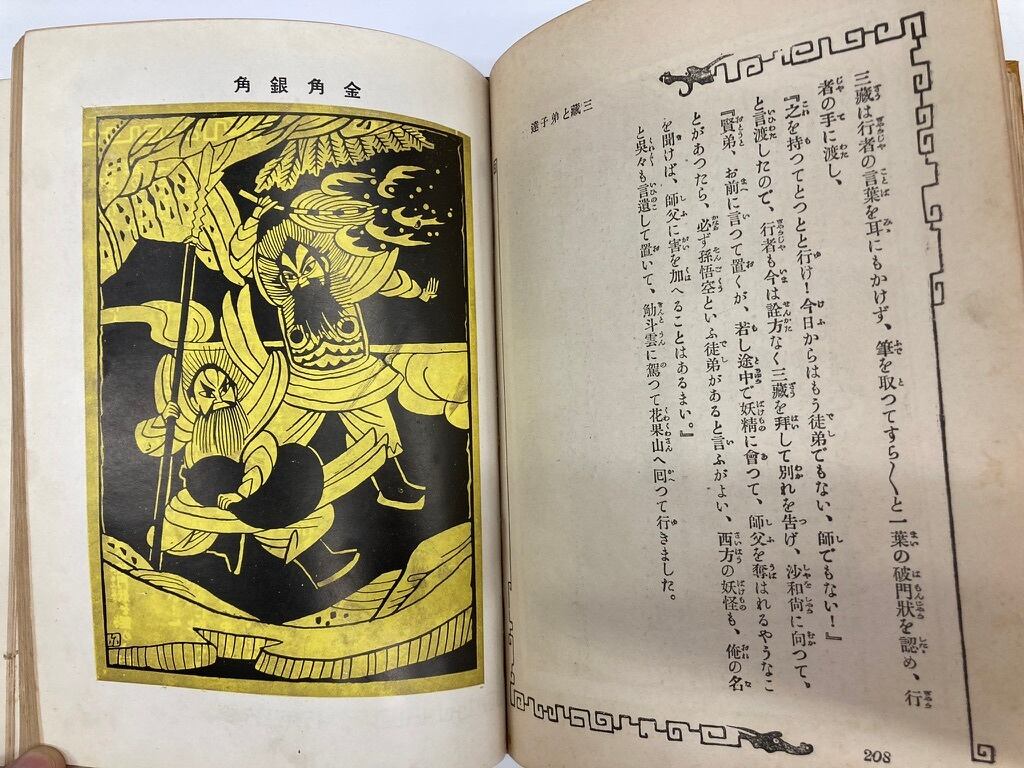 この本には挿絵を誰が描いたかの表記がなくて困りました。以前紹介した同じシリーズの「グリム御伽噺集」の広告ページには、装及絵 水島爾保布 岡本帰一とあって、ちょっと納得しかけたのだが何故表記されてないかがわからない。それにモノクロ一色の挿絵が横一で小さくなりすぎて見づらい、カラーページ担当の岡本帰一も。でも水島爾保布(みずしまにおう)は、後年「絵本西遊記」という傑作をものにしている。挿絵をよくみると、違う気がする。誰が描いたのだろう。とネットで西遊記・画像などと探していると、江戸末期大阪からでた「畫本西遊記」というのがあって挿絵は大原東野、歌川豊広、葛飾北斎などが担当しそれが転載されたらしい。つまり当初予定の水島爾保布は、描かなかった。謎は原色版や2色ページの力作だけど、絵の端にサインのようなものがあるのだけどわからない。おそらく岡本帰一ではないかと思うのだが不明。このシリーズは、絵に重きをおくシリーズなのだけれど、それが不明のいわくつきと言えるかな?模範家庭文庫 初版は大正9年の大正11年の5版 背の文字等はハゲて読めない状態 函ナシ 冨山房刊