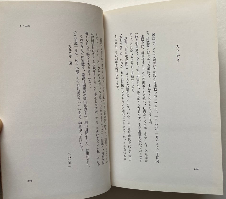 1994〜1998年「シンラ」に連載された短文エッセイ集です。故に全エッセイに和田誠の挿絵があり。ほとんどの見開きに挿絵があって、とても贅沢で嬉しい気分になります。そろそろ小沢昭一や山本夏彦あたりの本をゆっくり楽しみたいような感じにもってこいの本です。初版 1998年 新潮社刊