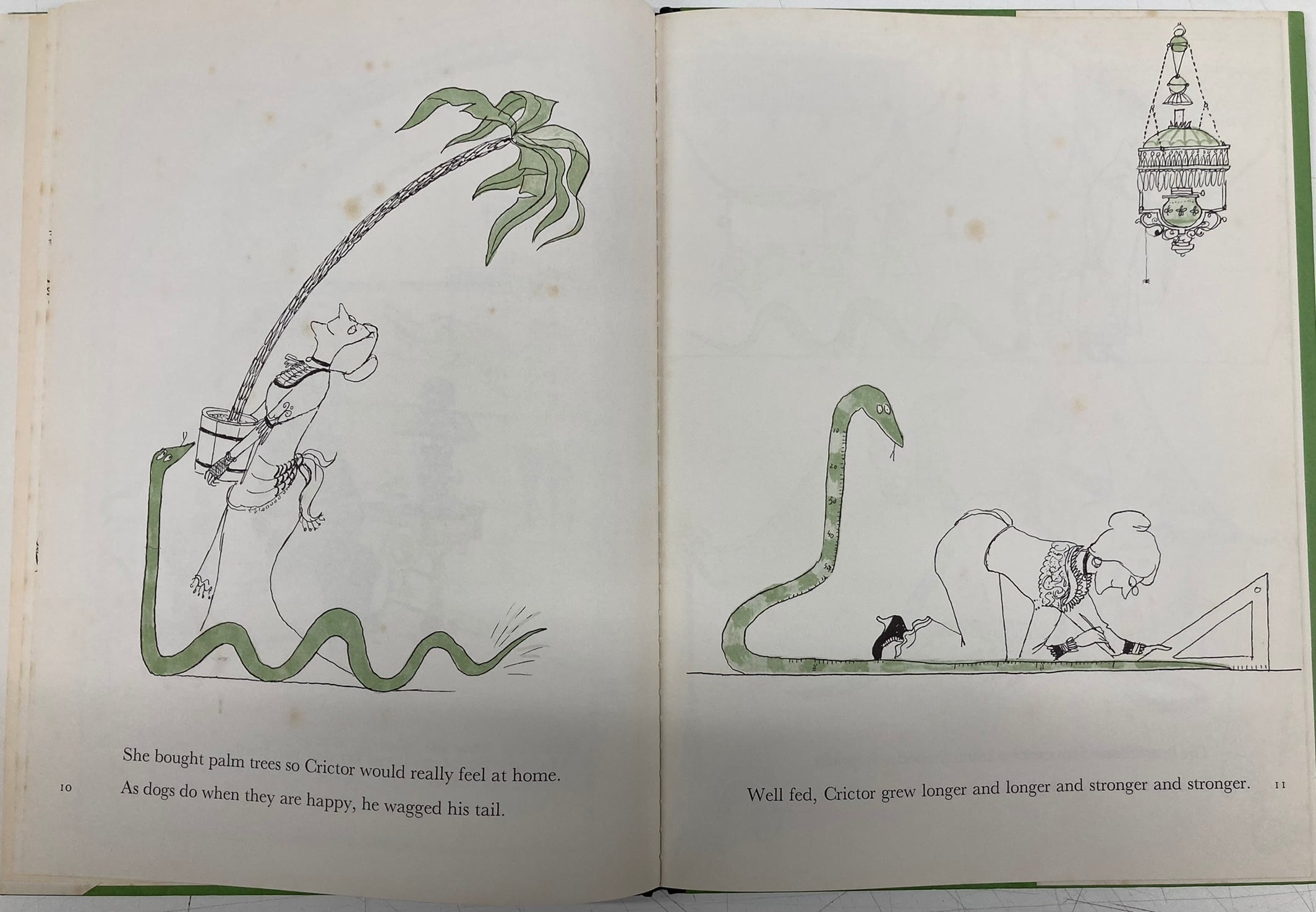 トミ・ウンゲラーの3冊目の絵本「ヘビのクリクター」 前年に最初の絵本「The Mellops Go Flying」をだしています 初期は、特色刷りでスミ、ミドリ、アカの関係がカバーがあり、ページにはシミがありますが、状態はいいです 1958年 初版 HARPER & ROW