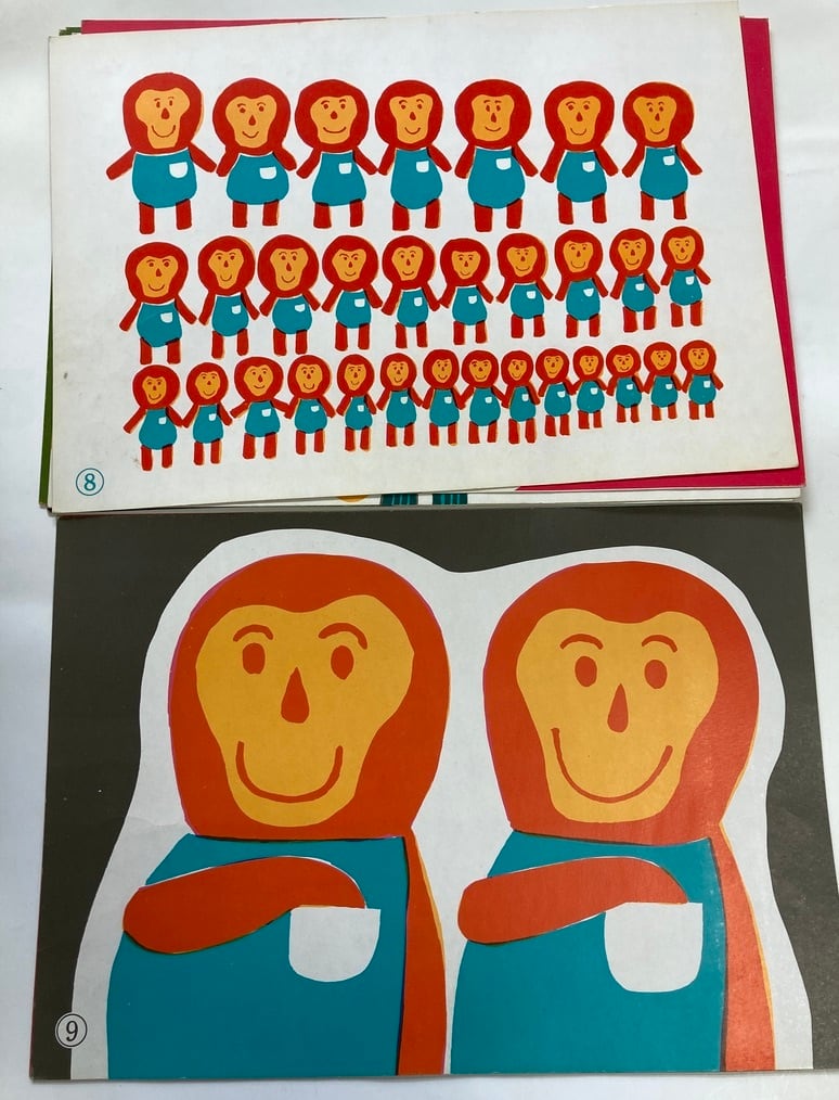 和田誠の数少ない紙芝居、文は今江祥智。絵は描き版といって、和田誠の原画をもとに、職人が版を描き分けて描かれたものかと思われます。函に補修テープあり。裏面(文字面)にマジックでなにか消した跡があります。紙芝居 昭和42年 初版 教育画劇刊