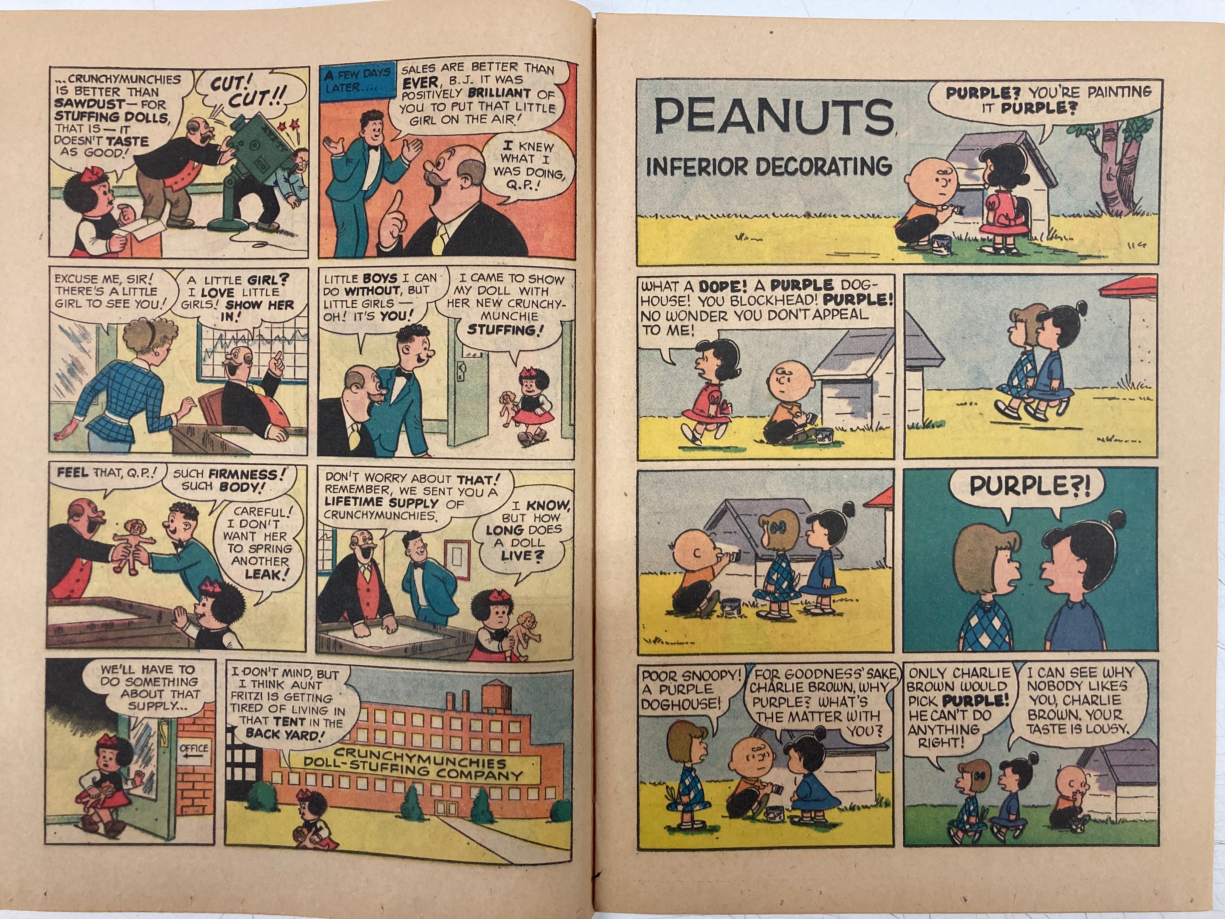 原田治、安西水丸、スージー甘金などが画題として描いているし、お気に入りの「NANCY」ですね。アメリカンコミックス。32ページのうち20ページが「NANCY and SLUGGO」。シュルツの「PEANAUTS」が4ページあります。このグラフィック、網点、版ズレ、いちいちがにくいね。表紙に描き込みあり、テープ跡もあります。1960年 DELL