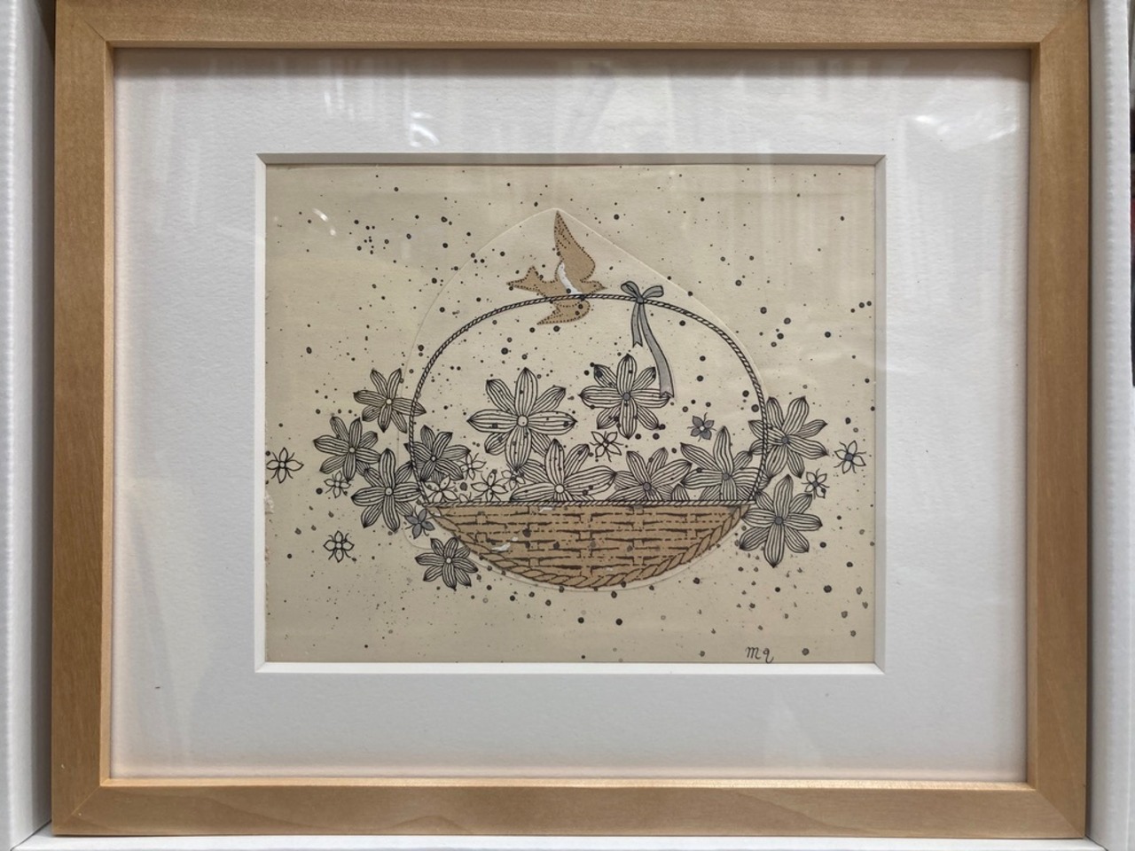 よく見ると、ホワイトで修正していたり。コラージュをしていたり。サインが、小文字のmaで、初期だと推定します。額はインチサイズ。