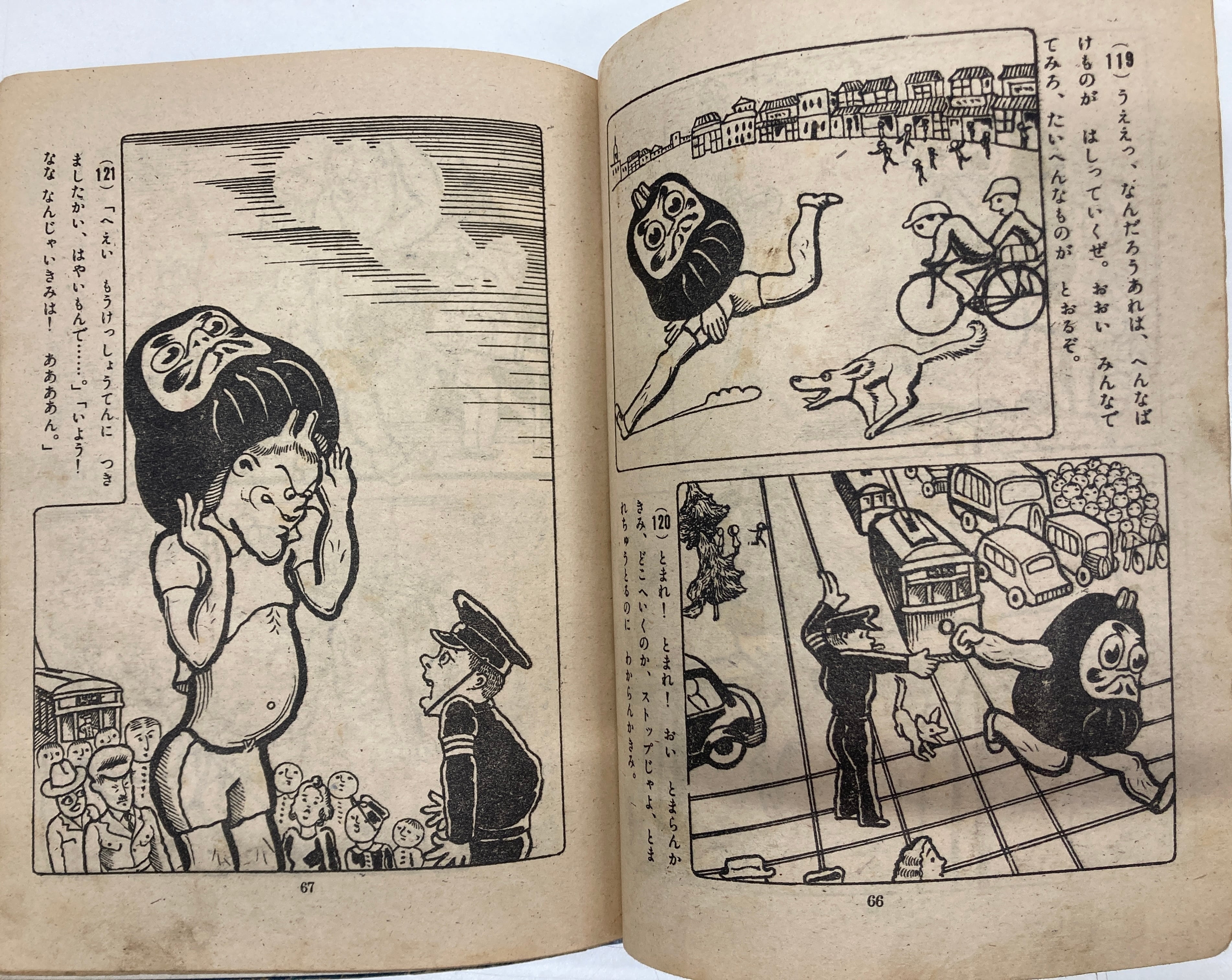 戦後に出た「講談社の漫画」シリーズの一冊。このシリーズには、茂田井武の「三百六十五日の珍旅行」、村山知義の「ほらふき先生」があります。背が青いテープで補修されています。経年のヨレ感あります。