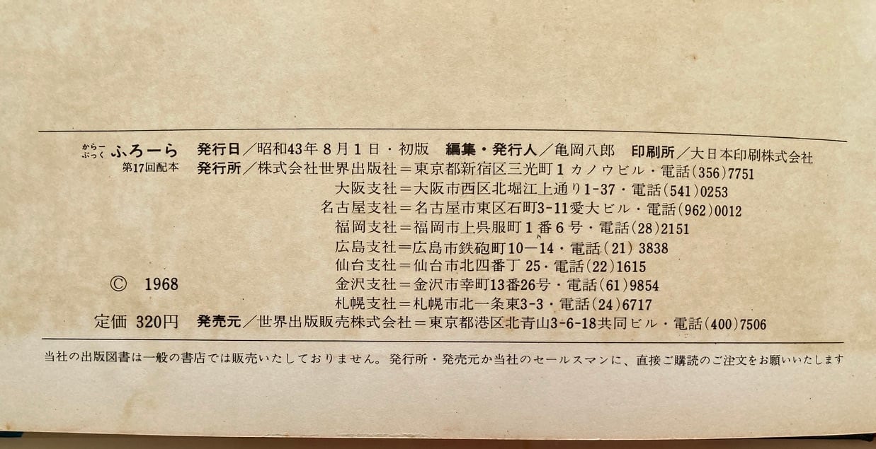 この世界出版社とは、おそらく訪問販売で契約して家にとどく絵本だったのでしょうね。奥付をみると、大阪、名古屋、福岡、広島、仙台、金沢、札幌に支社がある。それにしても魅力的な作家を使っています。からーぶっくふろーら 1968年 初版 世界出版社