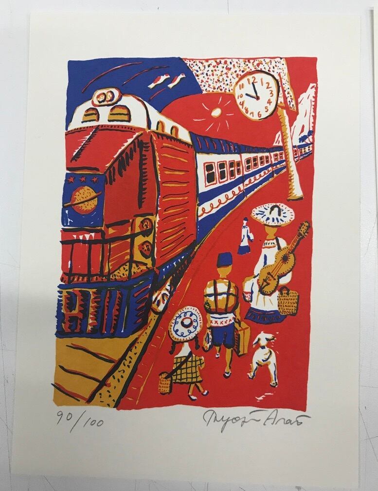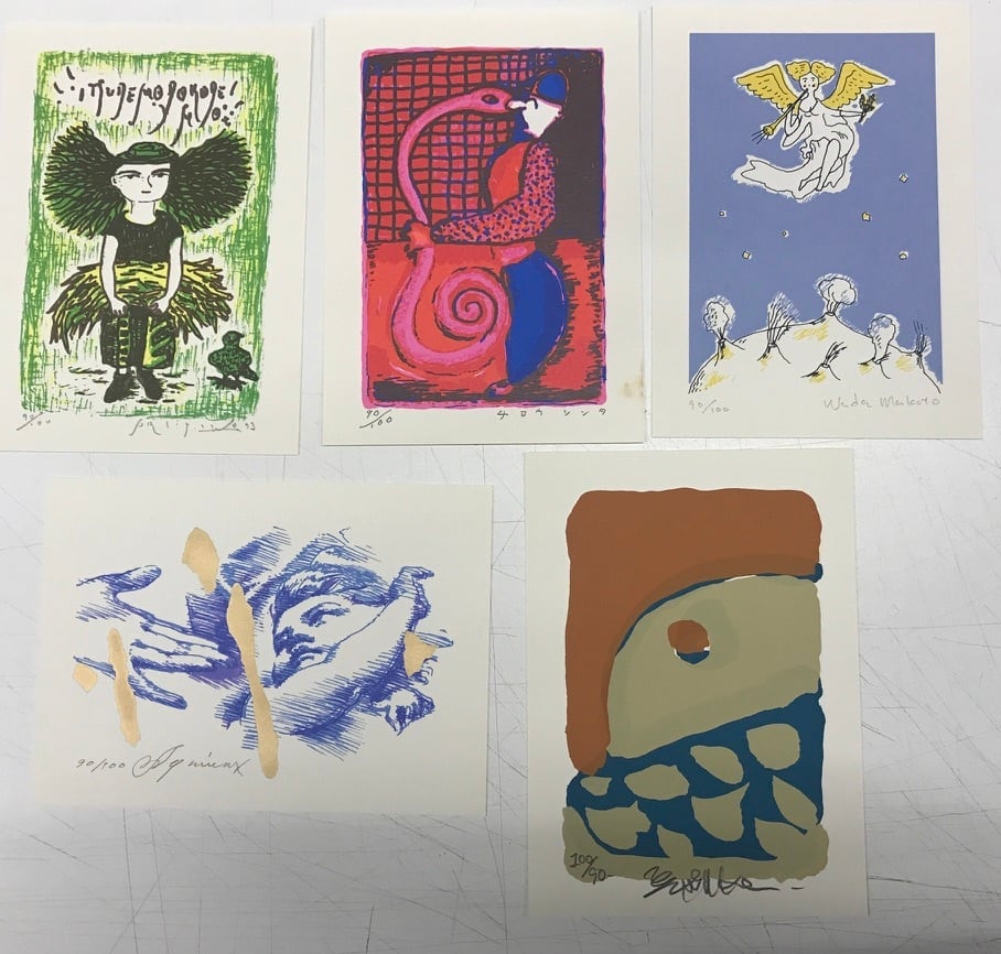 大好きな作家に参加してもらいました。この版画のおかげで当時のトムズボックスは、大変助かりました。参加していただいた作家は、長新太、井上洋介、宇野亜喜良、和田誠、片山健、木葉井悦子、スズキコージ、飯野和好、たむらしげる、荒井良二の10人です。たむらしげるのだけプリントアウト、ほかはシルクスクリーン。シートの大きさは18×13センチ エディションは、90/100 全てサイン入りです。長新太の版画の端にシミあり。