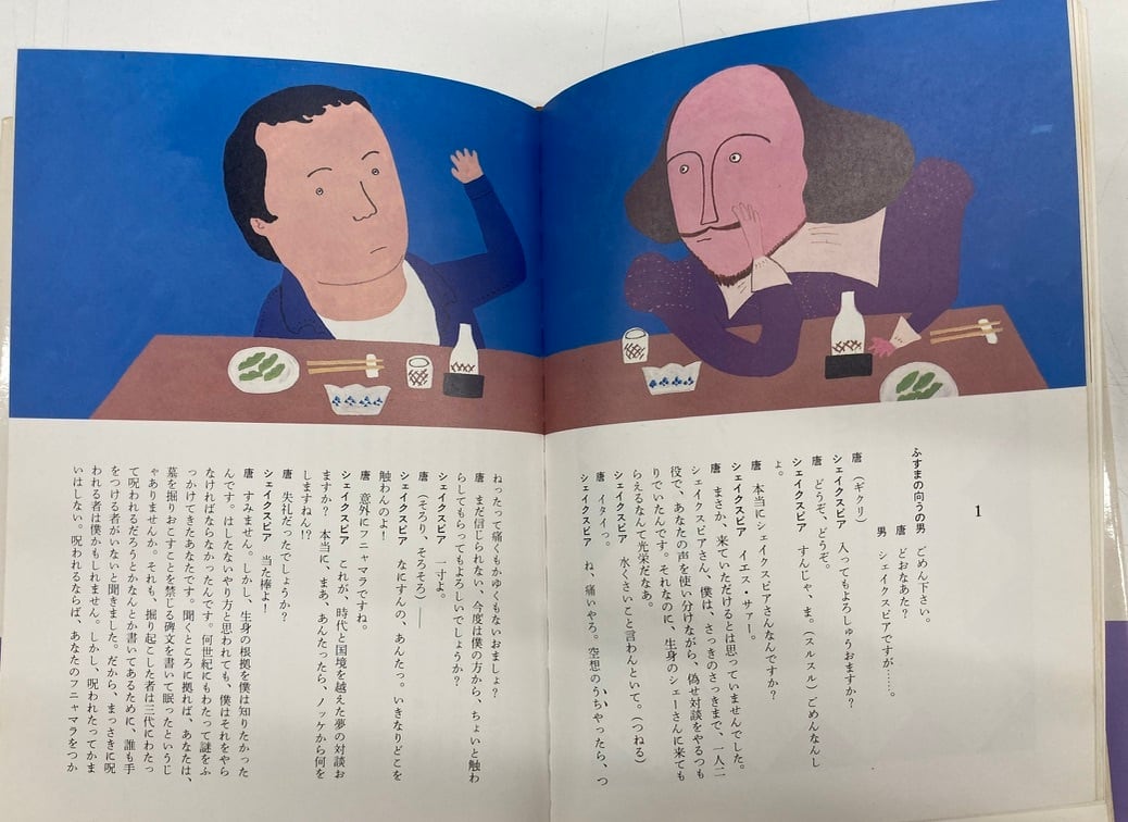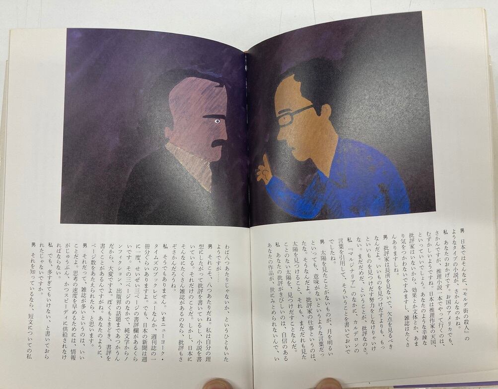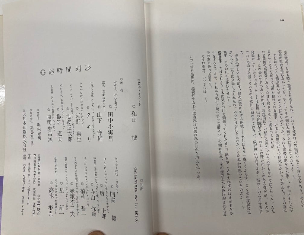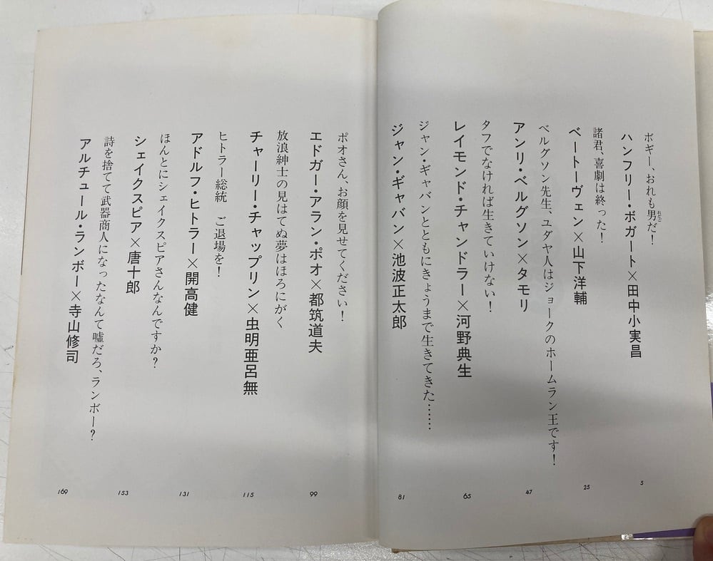 田中小実昌、山下洋輔、タモリ、河野典生、池波正太郎、都筑道夫、虫明亜呂無、開高健、唐十郎、寺山修司、植草甚一、赤塚不二夫、星新一、高木彬光が、過去の偉人?に会い対談を捏造するという企画、おもしろい。挿絵というかイラストレーションは和田誠が担当した。 1981年 初版 帯 集英社