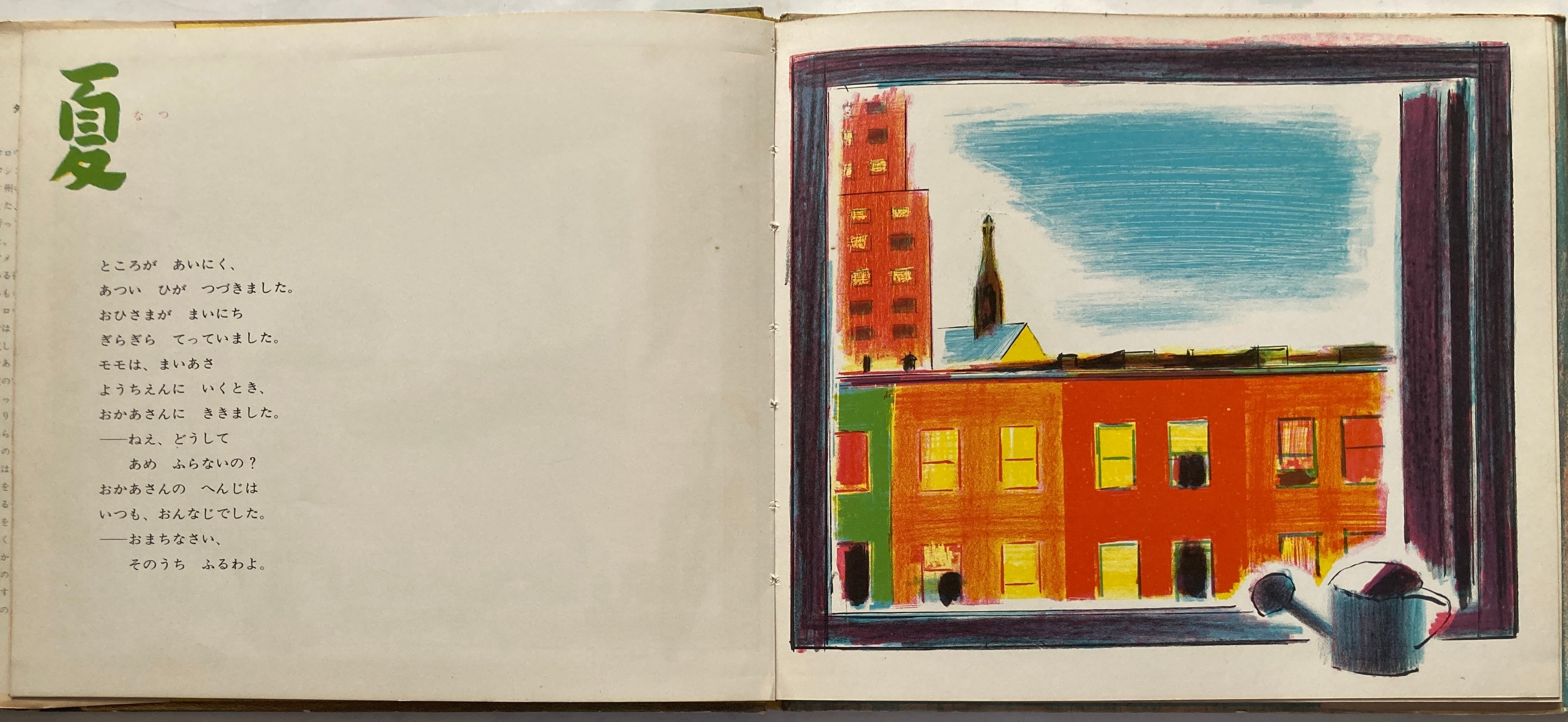 八島太郎は、1939年日本の軍国主義に反発しアメリカに渡りアメリカで成功した絵本作家。「UMBRELLA」は、代表作で福音館がリト刷の質感を生かしていますね。ちなみに印刷所は光村原色版印刷所。カバーは破れあり、よれよれです。 1963年 初版 福音館書店