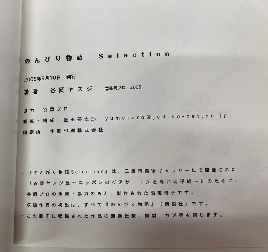 この冊子は、三鷹市美術ギャラリーにて開催された『谷岡ヤスジ展〜ニッポンの<アサー!>とと丸い地平線〜』のために、谷岡プロの承諾・協力のもと、制作された限定冊子です。とあります。版元が、三鷹市美術ギャラリーか谷岡プロがよくわかりません。 2005年 谷岡プロ 三鷹市美術ギャラリー
