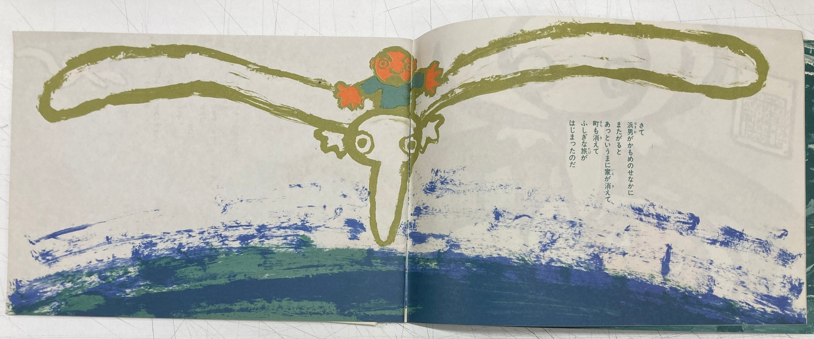 田島征三が、おそらく横浜市から依頼されて作られた絵本。かもめにのって、横浜の大昔からの歴史を見渡します。挟み込みの冊子には、当時横浜市長の飛鳥田一雄(社会党)が「お母さまがたへ」という文を載せています。田島征三の力作です。中綴じ48ページ。 1973年 横浜市広報課