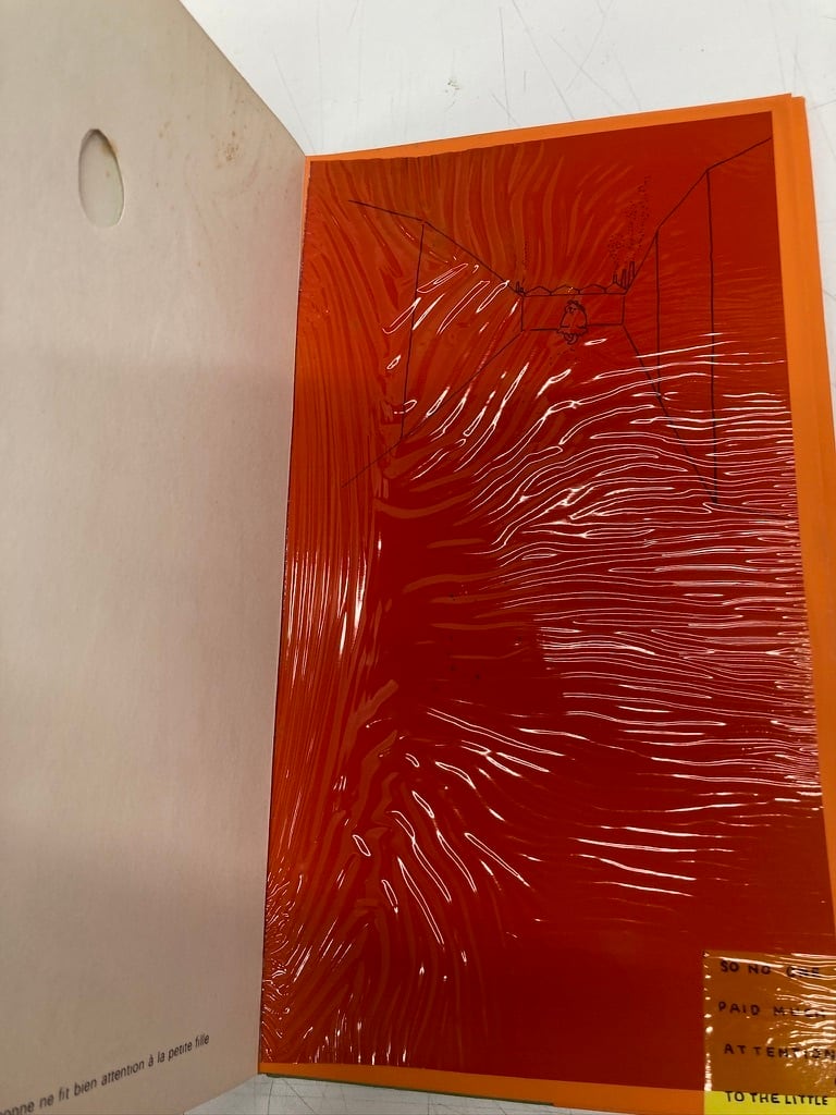 これは不思議な本です。どう見ても印刷はシルク、本文はパラフィンがはさんであたり、穴が不規則にたくさん開いていて、どうやってこの本をつくったのか不思議に思っていたら、日本で2007年にオフセット印刷で翻訳されて上梓されている。これがもっと不思議!!? 1964年 初版 Éditions Pierre Tisné