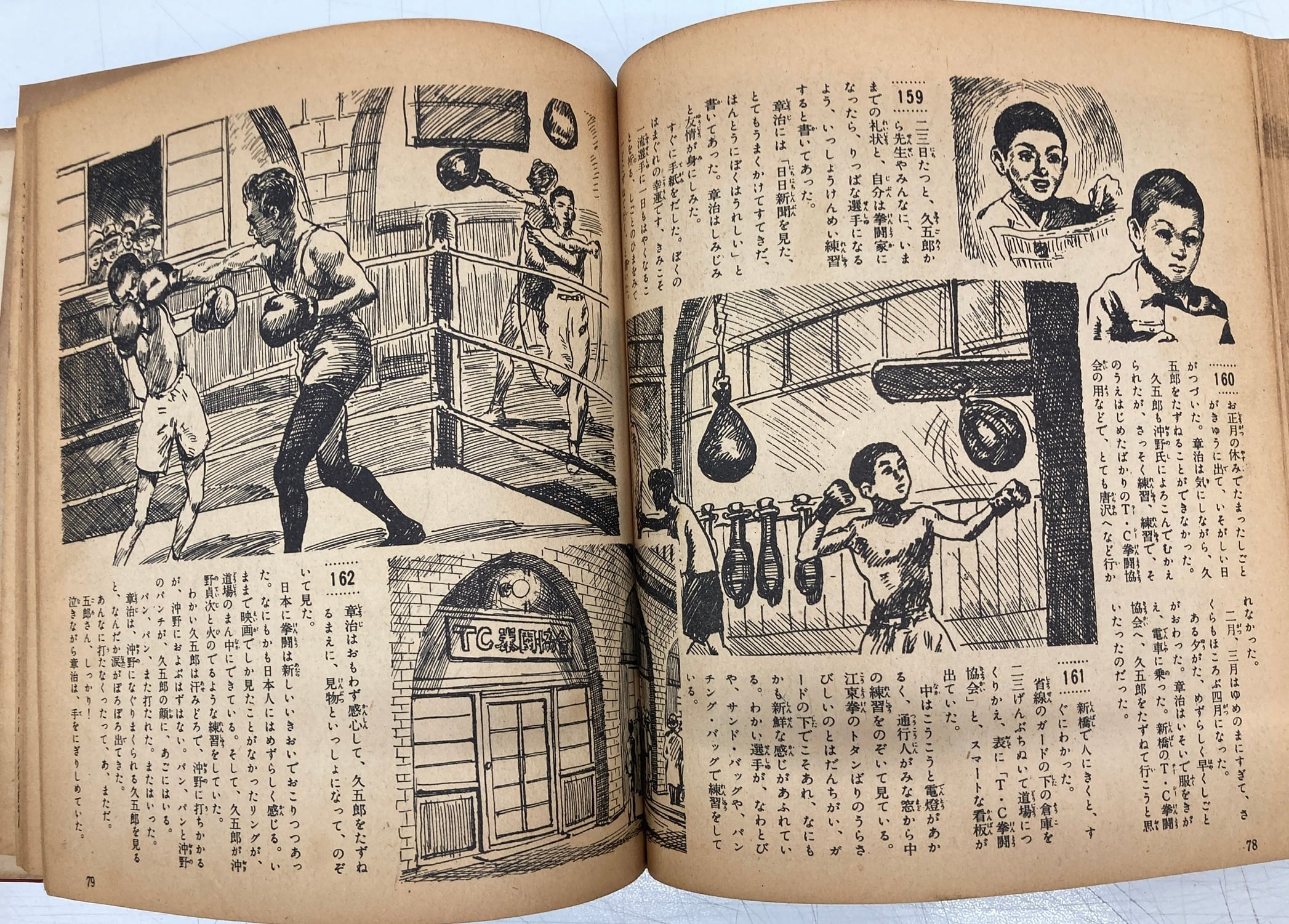 1949年から『漫画少年』で連載した『ノックアウトQ』は、少年時代に親友だったボクサー木村久をモデルにし、梶原一騎が少年時代に感化院でこれを読んで感動した体験が、ボクシング漫画『あしたのジョー』の原作を引き受けた背景になっている。とWikipediaから。絵物語はいいですね。子どものころ本を読んでいると次の挿絵のあるページまで読みすすむのが苦痛で、まだかまだかとページをめくっていましたが、この本は毎ページに挿絵が何個もあって、贅沢です。 昭和27年初版の28年再版 学童社