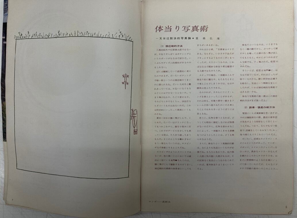 ロッコールは、ミノルタカメラ愛用の人々に向けた雑誌。構成・レイアウトを堀内誠一が担当。グラビア印刷がキレイです。長新太のとても抽象的なマンガが3点収録されています。堀内誠一が長新太に依頼し、原稿の納品にきたとき、たまたま堀内が絵本の原画を並べて描いていてマンガ家の長がカラーで描けていいなあ。と羨んだのが、長新太が絵本を描き始めたきっかけになったと、どこかで読んだことがあります。はてさてこの長新太のマンガだったのでしょうか? 1958年 ロッコール編集室