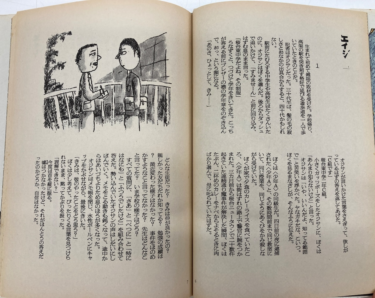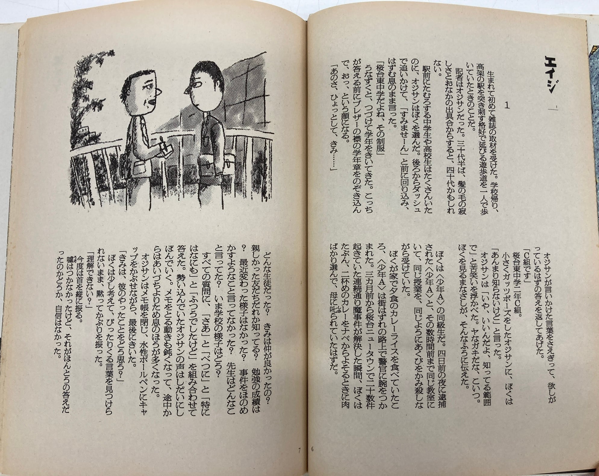 帯に、山本周五郎賞受賞。「エイジ」の新聞連載版イラスト全部収録 とあります。これはうれしい、だいたい新聞連載の小説は、単行本になるとき、ほとんど挿絵はなくなります。ブックデザイン・シューヘイガレージとあります。本文紙・フォント・絵の網点の荒さ?全部いいですね。 1999年 初版 帯 朝日新聞社