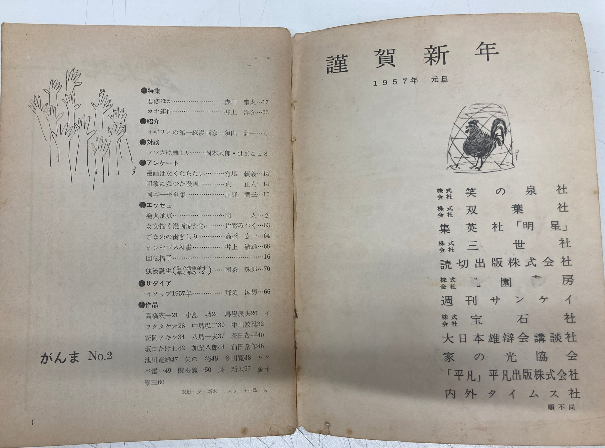 当時若手漫画家があつまり新しい漫画表現を目指して作られた同人誌「がんま」2号。小島功を中心に長新太や井上洋介など16人の漫画家たちがあつまった。「マンガは難しい」という岡本太郎と辻まことの対談収録。B6サイズ64ページ。 1957年 独立漫画派編集