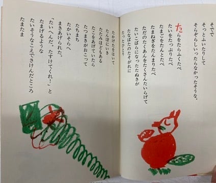 松岡享子のあいうえおの、あから始まる早口言葉のような文章の羅列に長新太がオレンジとミドリのクレヨンで挿絵を描く。おもしろい企画の絵本です。長年のロングセラーだったのだけど、現在は判型を変えて新装版ででています。初期の函入りは珍しい。 函 1973年 初版 福音館書店