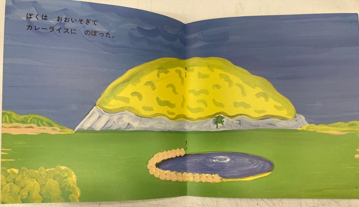 年少版だからこそなのでしょうか。絵本のたにしみに、長新太は「100000匹の蛙にカレーをすすめたら、一匹ぐらいカレーライスが大好きなのがいるはずです。自由自在にいろいろなことを考えるのはオモシロイ。」と書いています。 年少版こどものとも139号 絵本のたのしみ 1988年 福音館書店