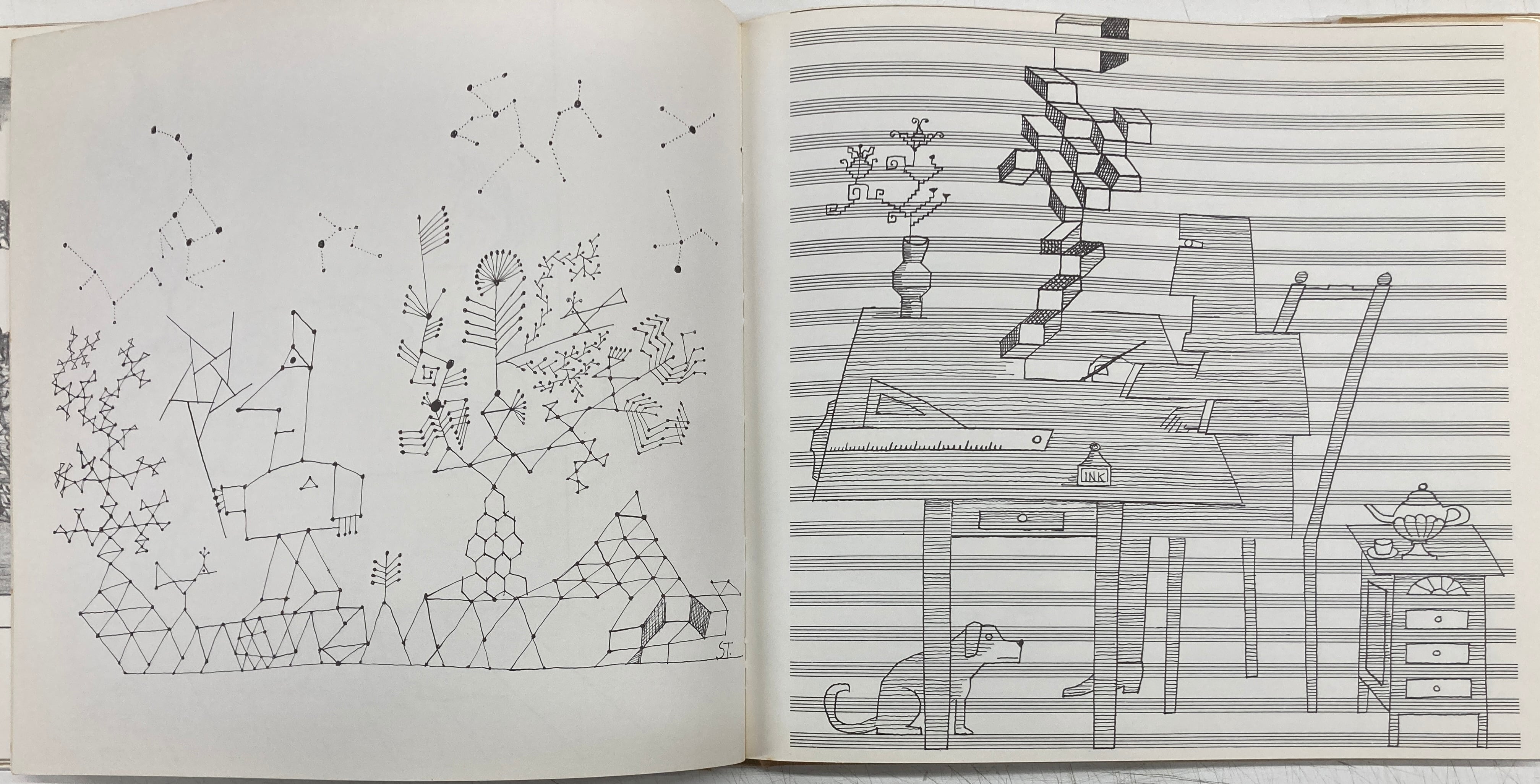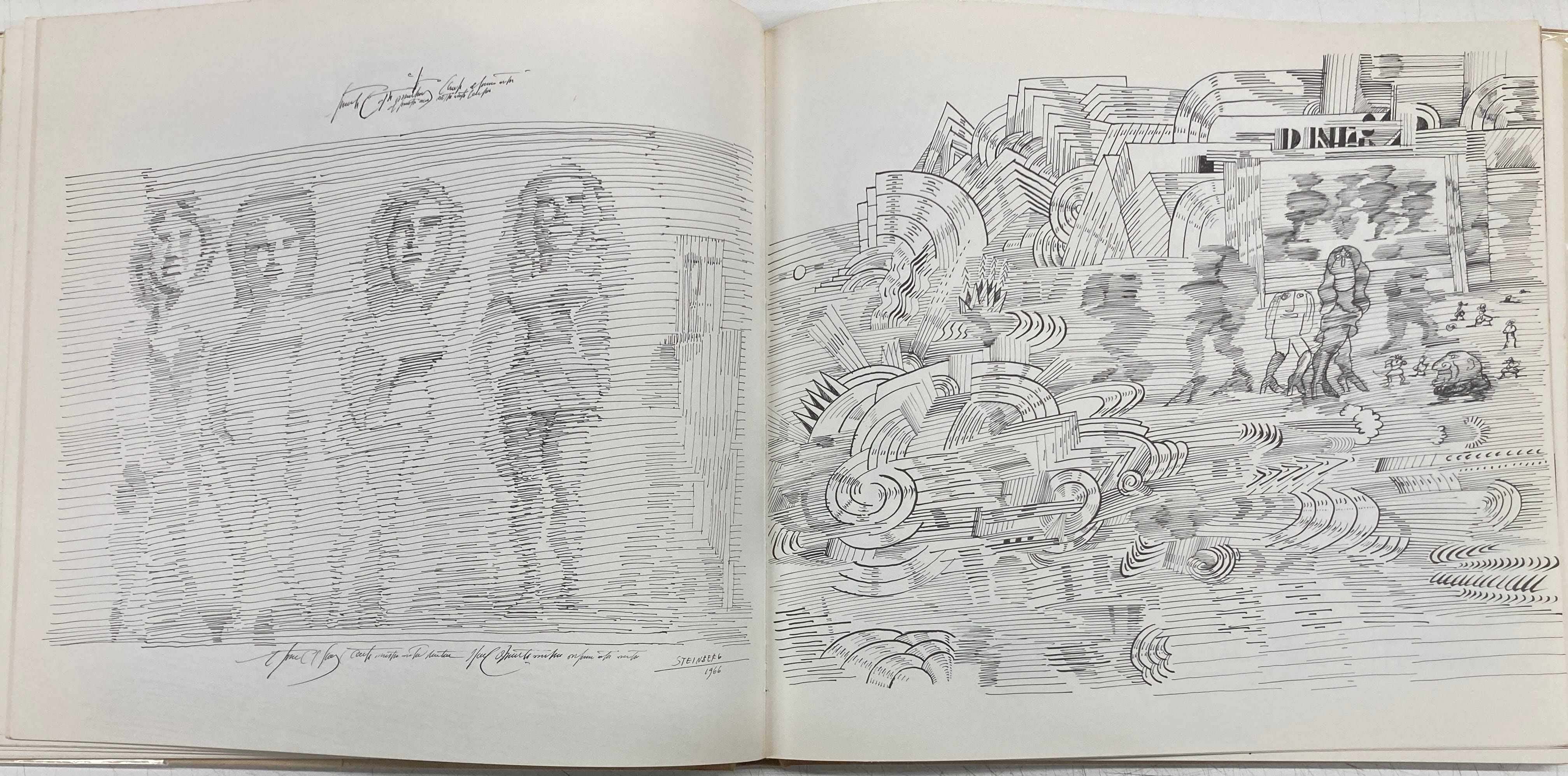 スタインバーグの画集では6冊目です。1945年に「ALL IN LINE」でデヴューして5年に一冊くらいのペースで画集を上梓しています。このゆったり感が、画集に描かれているモノクロの線の遊び、陰影の遊び、そしてナンセンスの遊びにうまくリンクしているように思うえます。イギリス版 1973年 Thames and Hudson