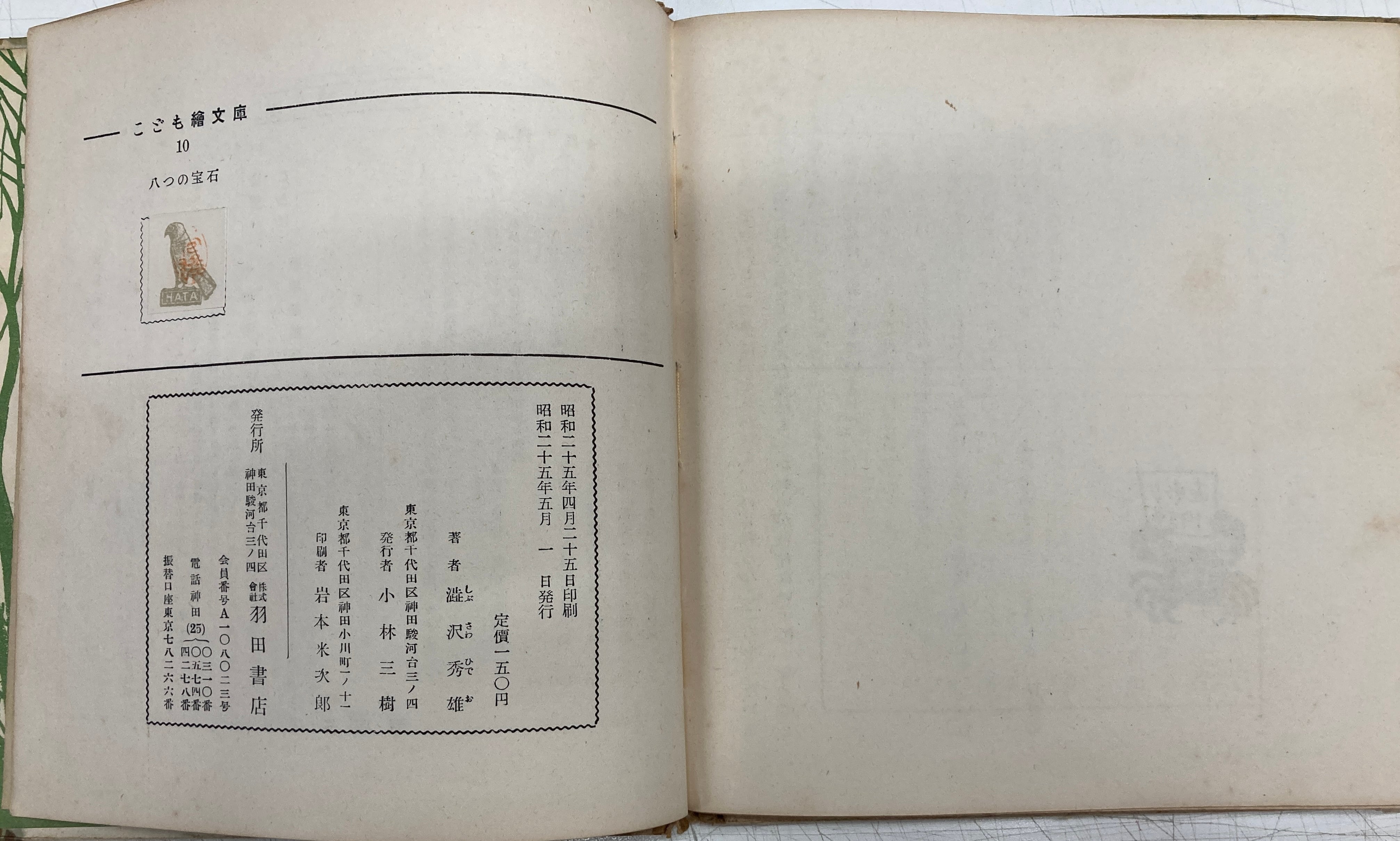 羽田書店は、総理大臣にもなった政治家羽田孜の実家だと、太田大八からきいたことがある 戦後5年で羽田書店は、この「こども繪文庫」シリーズをだしている イラスト・挿絵で太田の他、熊田五郎(熊田千佳慕)、立石鉄臣などをつかっている 文の渋沢秀雄は、渋沢栄一の四男 本文はスミ一色、水彩で色をつけてしまったページが数ページあります(写真参照) こども繪文庫10 1950年(昭25) 初版 羽田書店