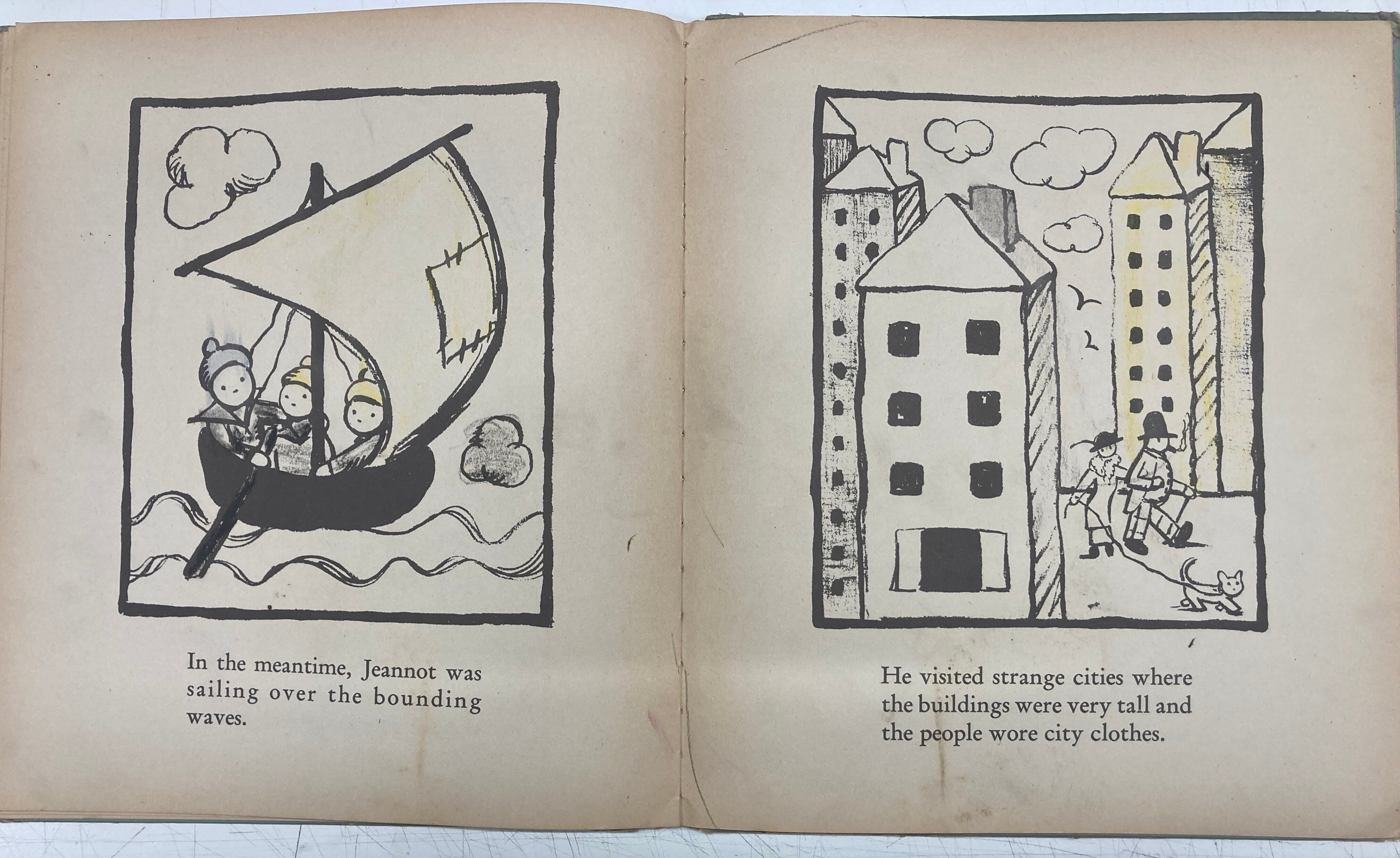 1937年のフランソワーズは、まだ絵のスタイルが確立していない感じがします カラーページとモノクロページが交互にありますが、モノクロページは、子どもが色を塗っている形跡があります 経年のヨレ 1937年 Grosset & Dunlap
