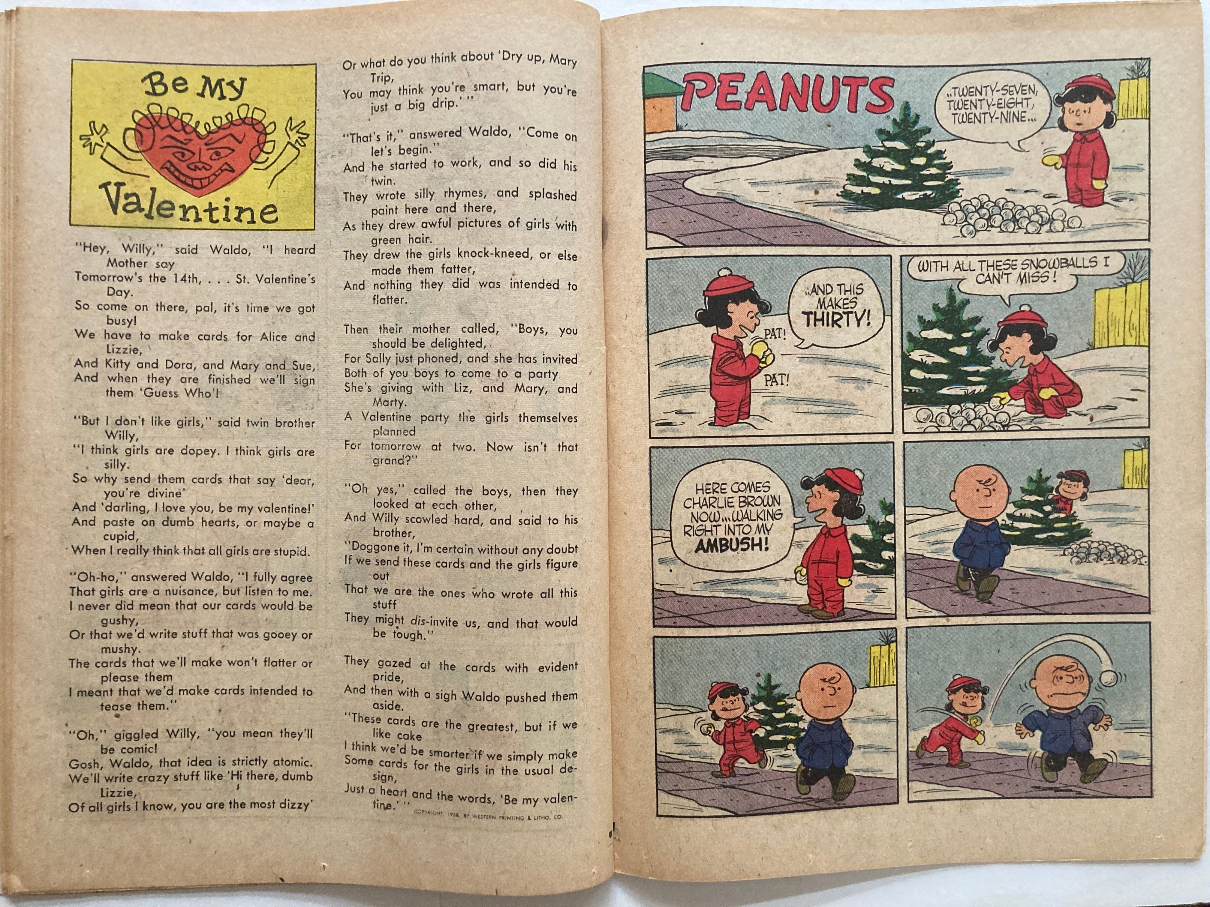 原田治、安西水丸、スージー甘金などが画題として描いているし、お気に入りの「NANCY」です アメリカンコミックス 32ページのうち20ページ強が「NANCY」 シュルツの「PEANAUTS」が4ページ このグラフィック、網点、版ズレ、いちいちがうれしい 表紙に描き込みあり 1958年 DELL