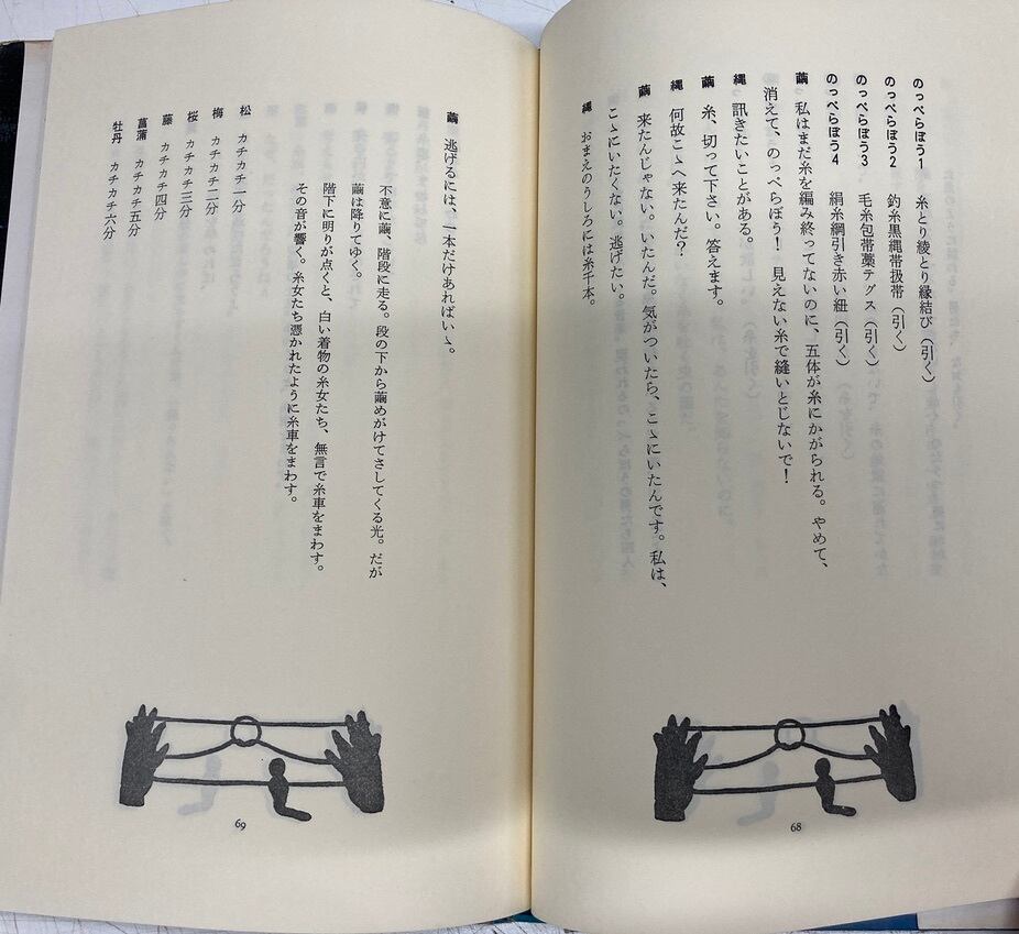 一見片山健の装丁に思われないがよく見ると片山健 本文下には、糸地獄のごとくあやとりに絡まった人間の図が配置されています 1984年 縦帯 出帆新社